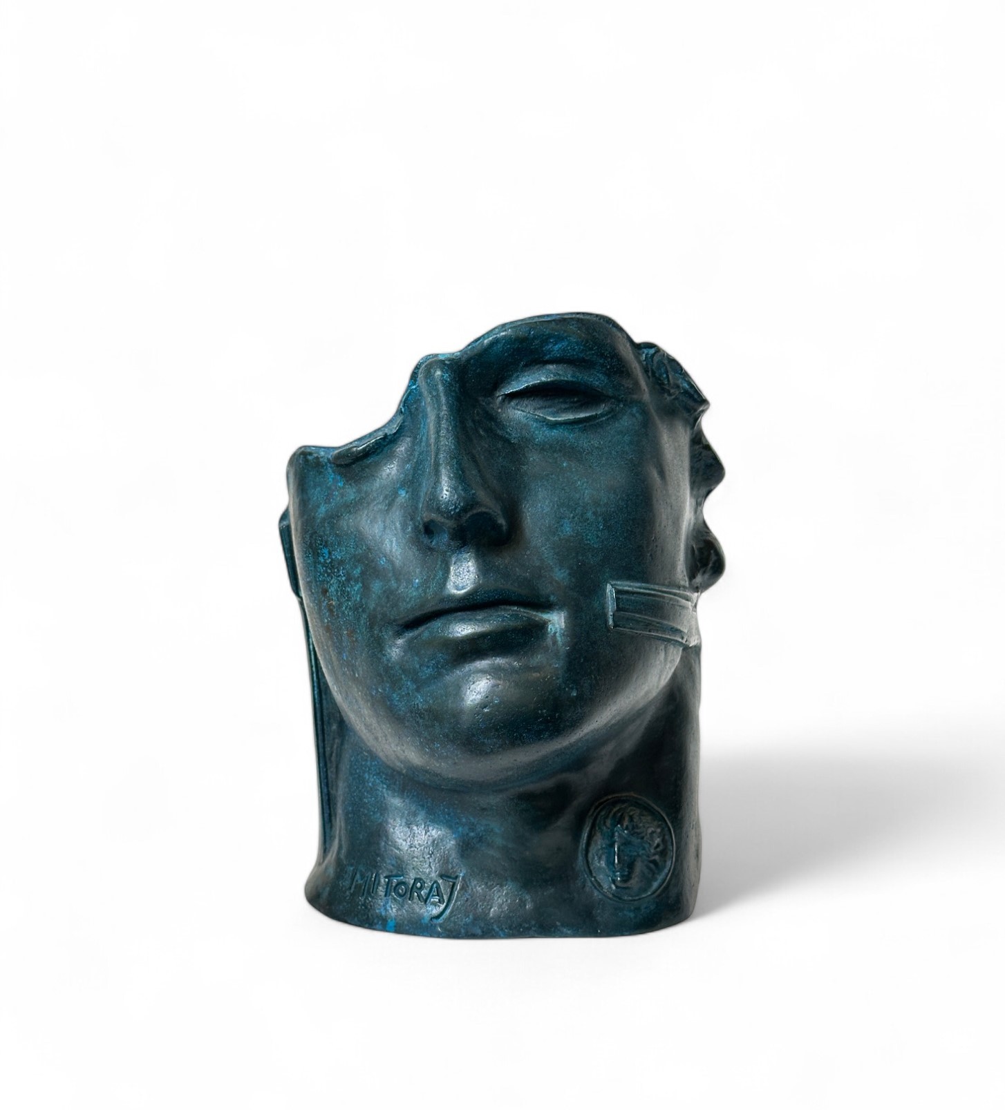 The subject is a male bust, the face is partially turned to the left, the eyes are closed, the chin strong and the nose straight, but the forehead and cheeks are lacunar, as if gnawed or erased.