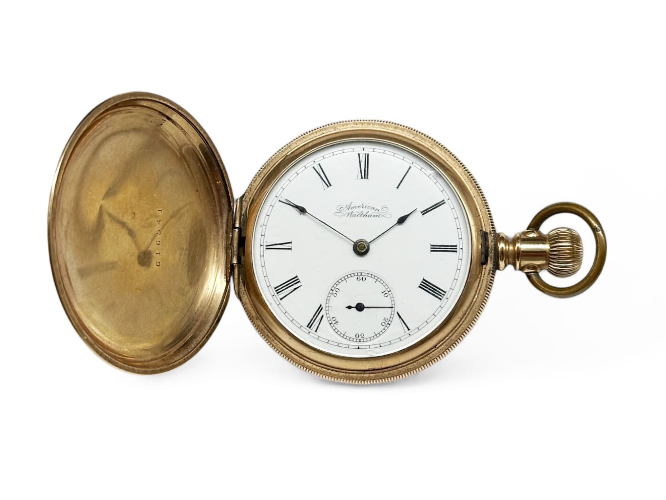 American Waltham pocket watch in yellow gold (750) with guilloché case White enamelled dial with Roman numerals and railway minute track, second hand to the 6 Marked on the inside back C.W.C. Co and numbered 616541 Diameter: 52 mm Gross weight: 117.5 grams Small chips to glass and enamel