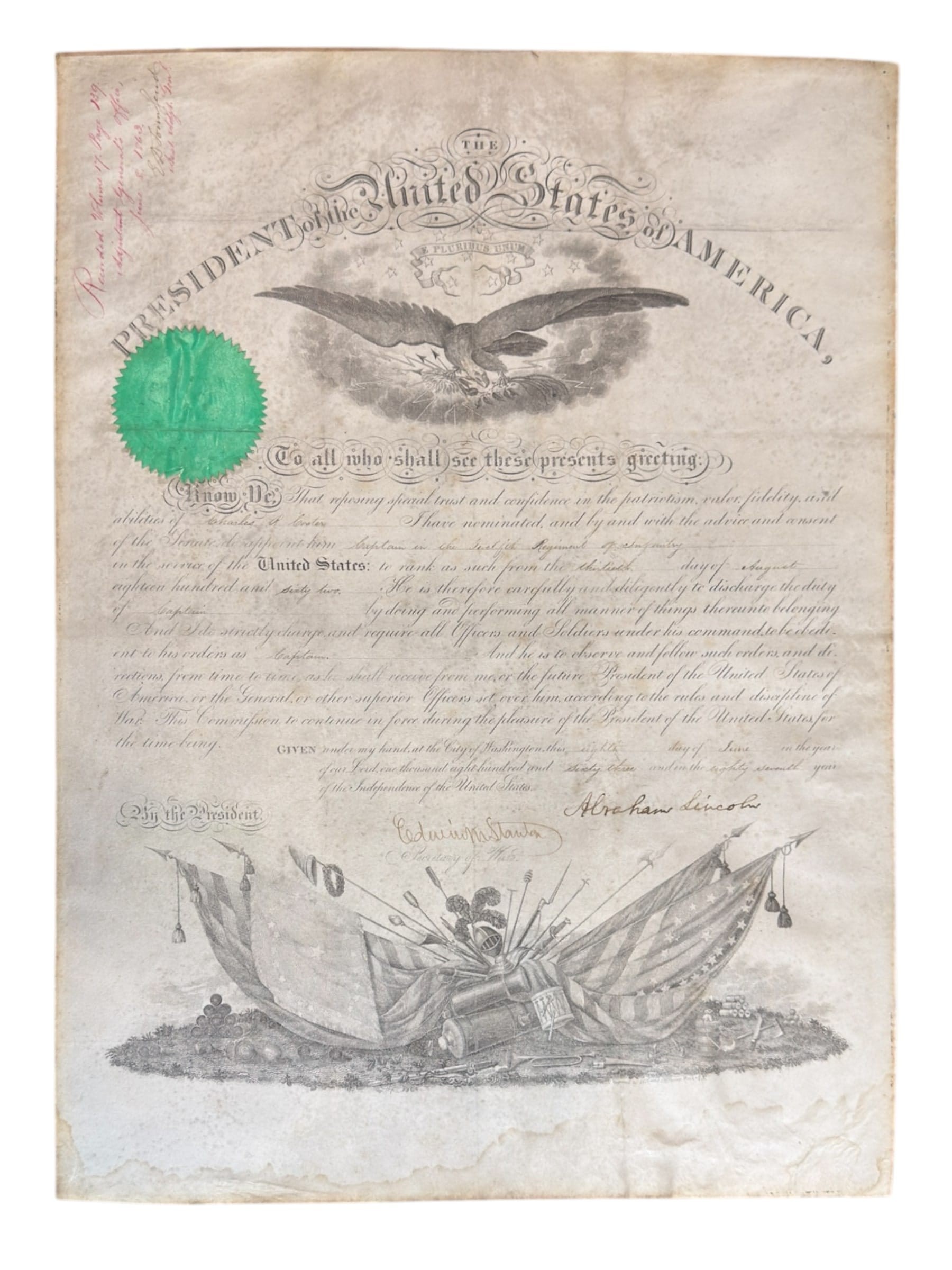 Engraved document on parchment with handwritten additions. Autograph signature of Abraham LINCOLN, as President of the United States of America, and countersignature of Edwin M. STANTON (1814-1869), as Secretary of War. Green paper stamp. Registration in upper left corner in red ink.