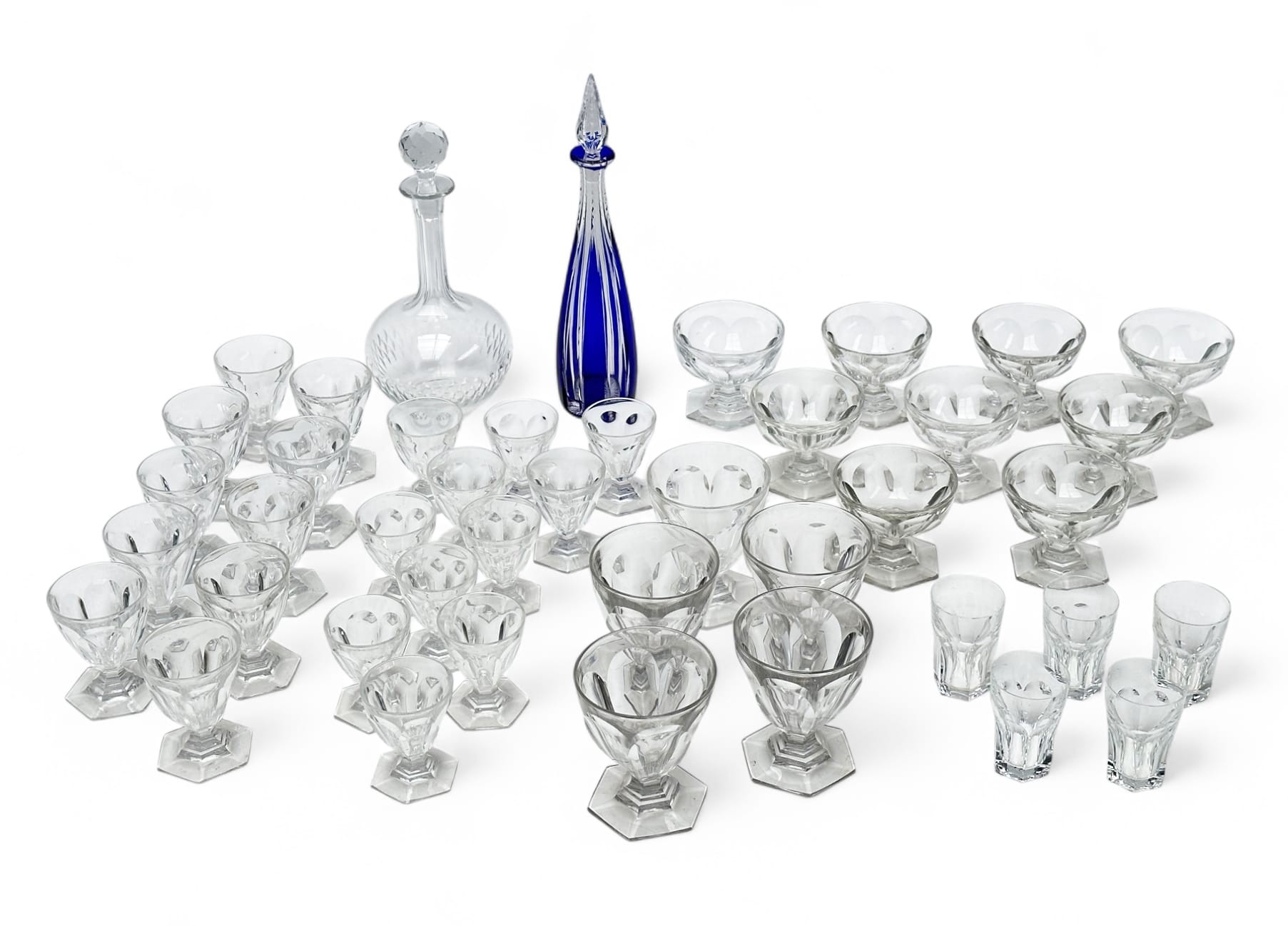 BACCARAT Set of 40 crystal glasses, Bourbon model Including 5 water glasses, 10 white wine glasses, 11 red wine glasses, 9 champagne glasses and 5 liqueur glasses. A partially blue crystal decanter and stopper and a glass decanter and faceted stopper are included. Minor chips
