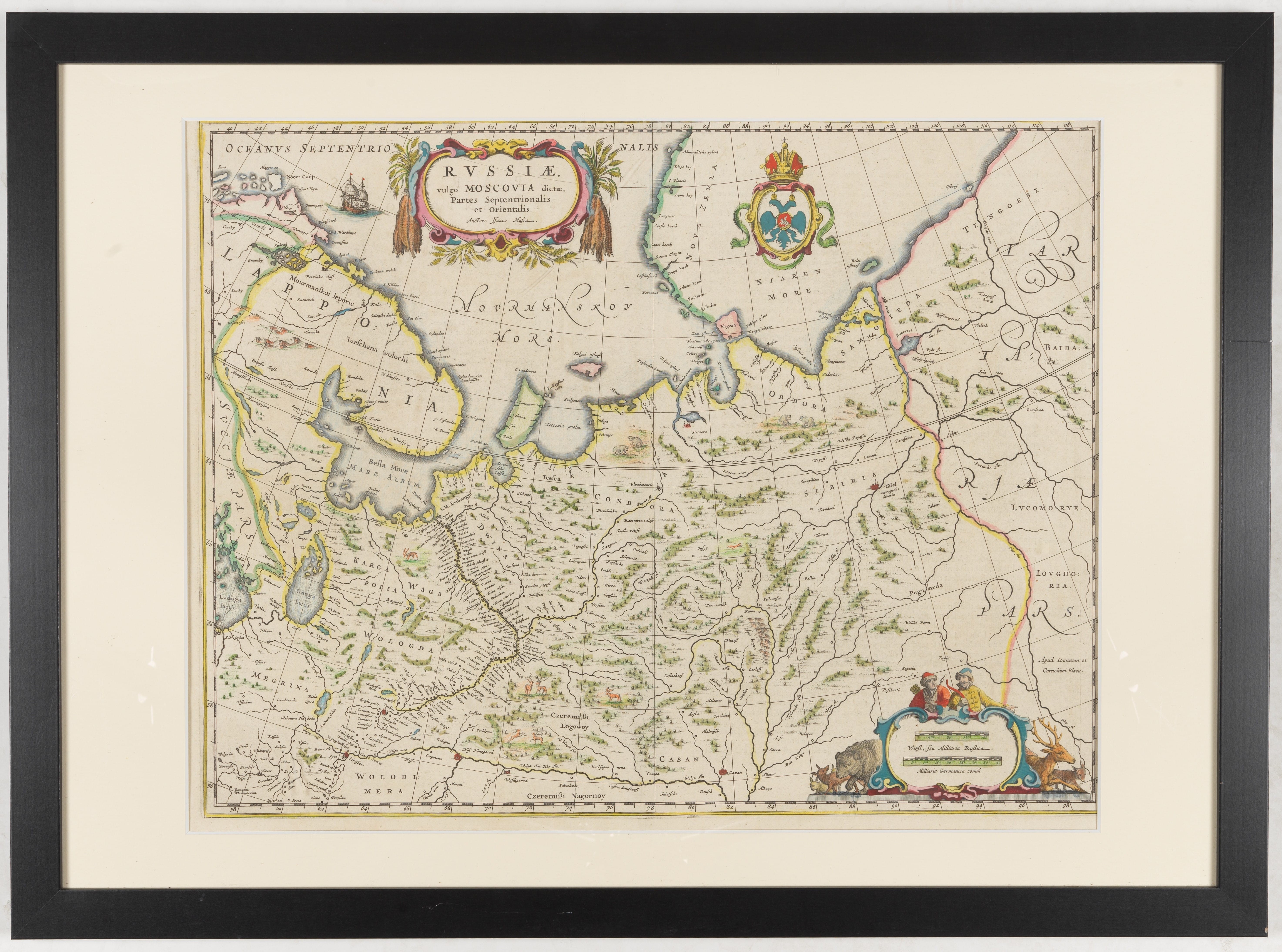 BLAEU, J. & C. Russiae vulgo Moscovia dictae, Partes Septentrionalis. Amsterdam, 1647. Fine contemporary col. Framed (not examined out of frame). A fine copy. 418 x 540 mm The map's cartographer is Isaac Massa (1586-1643), a Dutch cartographer and traveler. The map shows the Murmansk Sea and the west coast of New Zealand to the north, and Lapland to the northwest. Adorned with a title cartouche and a scale cartouche depicting 2 hunters, bears, a deer, etc., and a coat of arms with the Russian coat of arms. Expert : Béatrice Loeb-Larocque