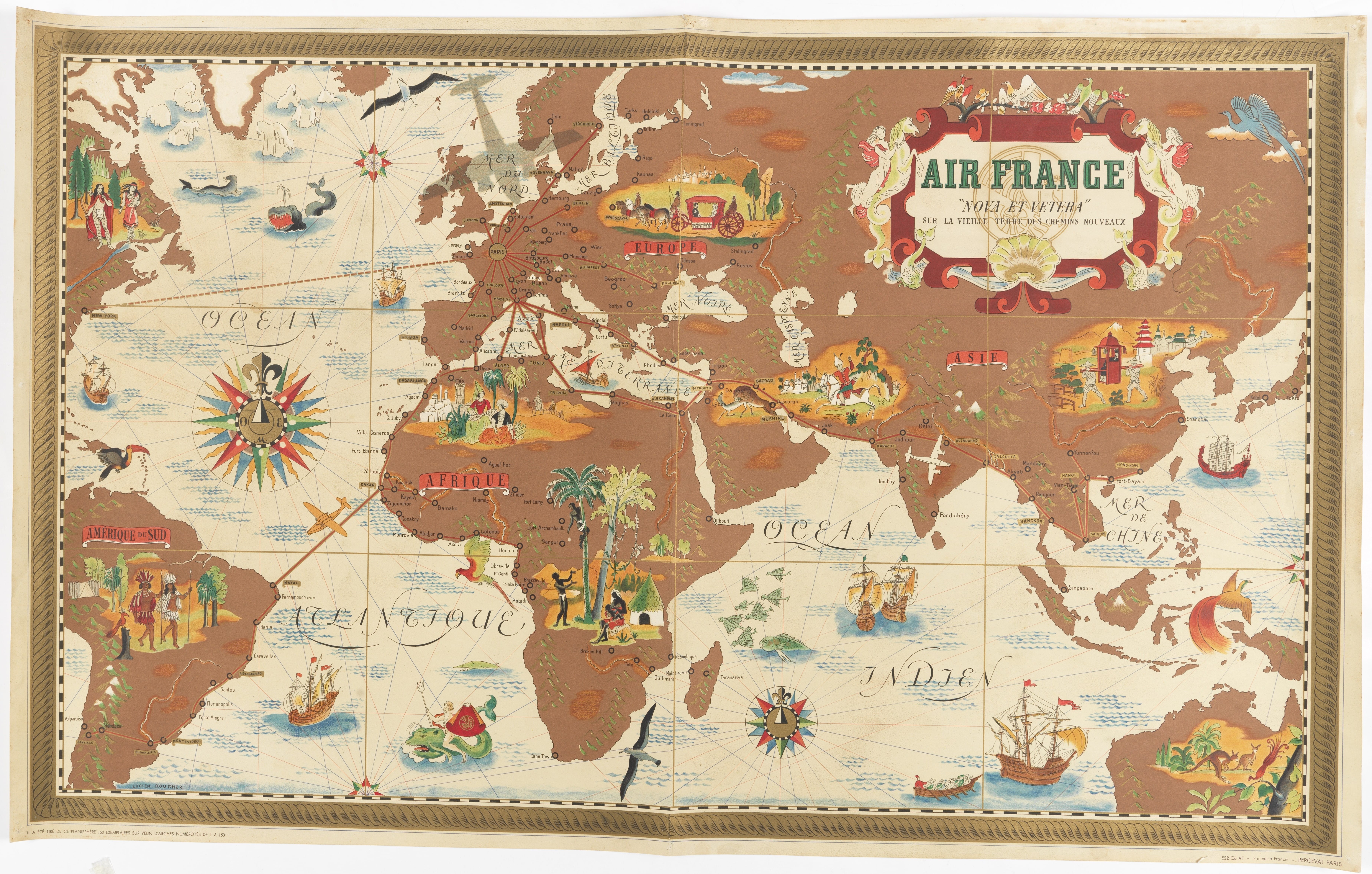 BOUCHER, L. Air France - Nova et Vetera Sur la vieille terre des chemins nouveaux. Imprimerie Perceval, Paris, 1938. Color lithograph. Marked median fold. A good copy. 620 x 1000 mm