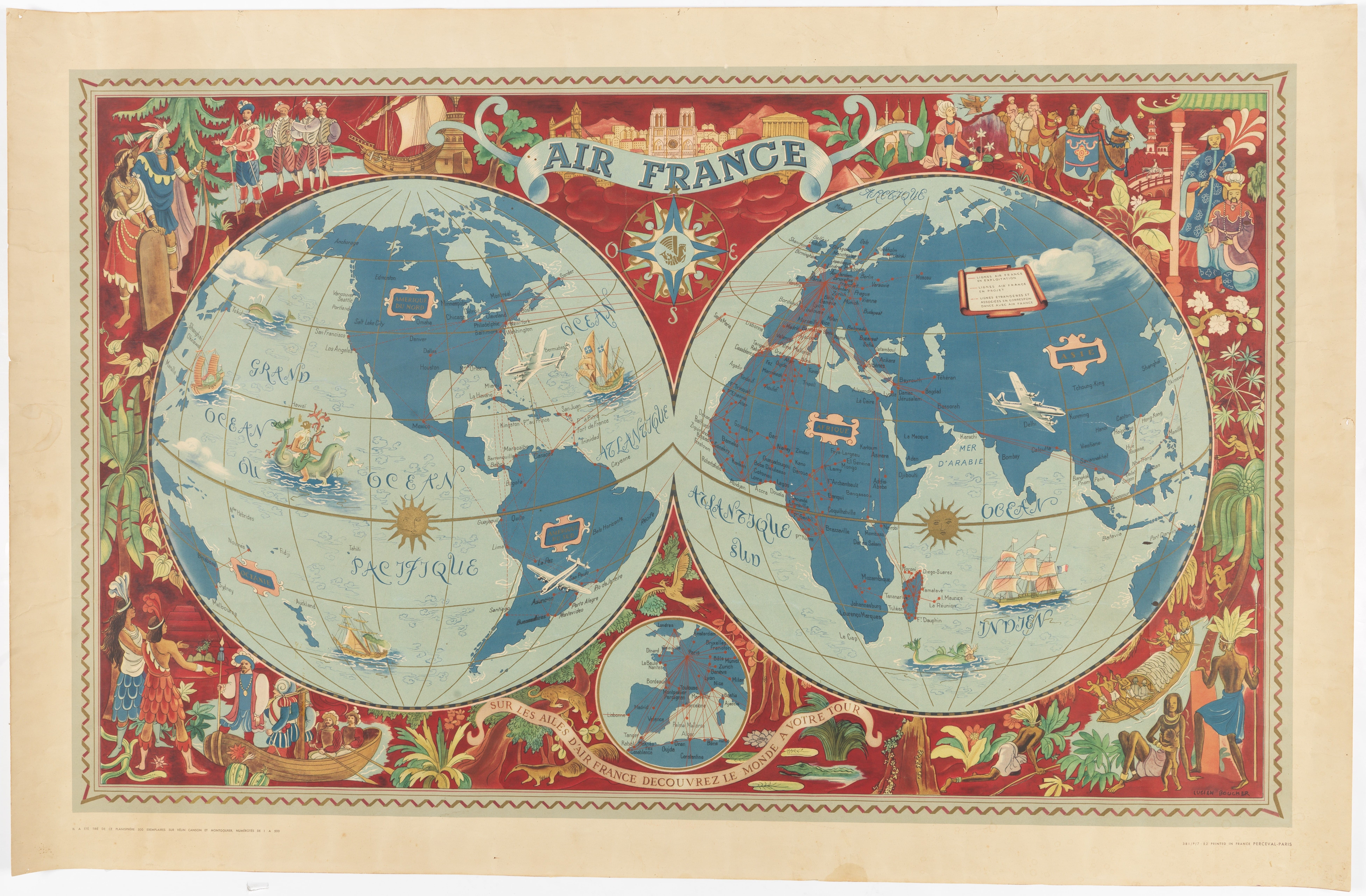 BOUCHER, L. Air France - Sur les ailes d'Air France découvrez le monde à votre tour. Perceval, Paris, 1952. Lithographed in color Paper slightly browned and creased. 660 x 1020 mm