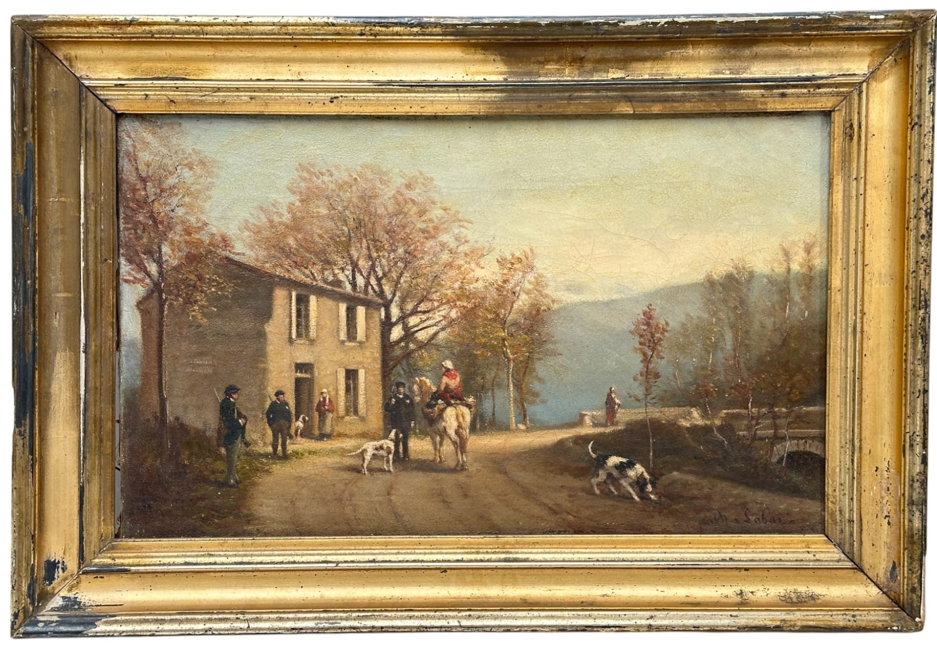 Charles DABOR (1813-1900) Hunters on the path near the bridge Oil on canvas Signed lower right 27 x 45 cm