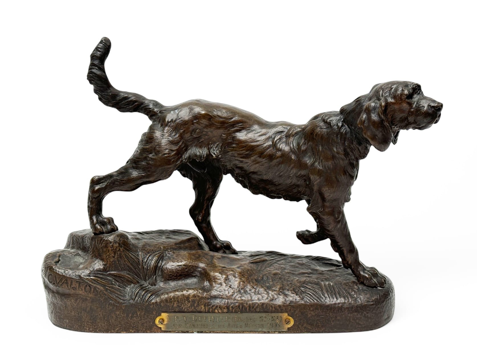 Charles VALTON (1851-1918) Hunting dog Bronze with brown patina Signed on the terrace Bearing a cartel gift to P.V. Duvivier "ses Camarades des Arts & Métiers 1903". L : 31 cm