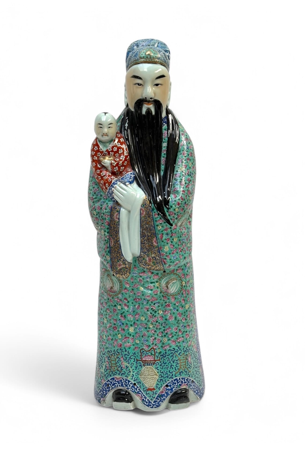 CHINA, 20th century Porcelain and polychrome enamel statuette representing one of the three stars of the Tao Fuxing holding a child. Height: 63 cm Some black enamel missing from the beard Expert : Johanna Blancard de Léry