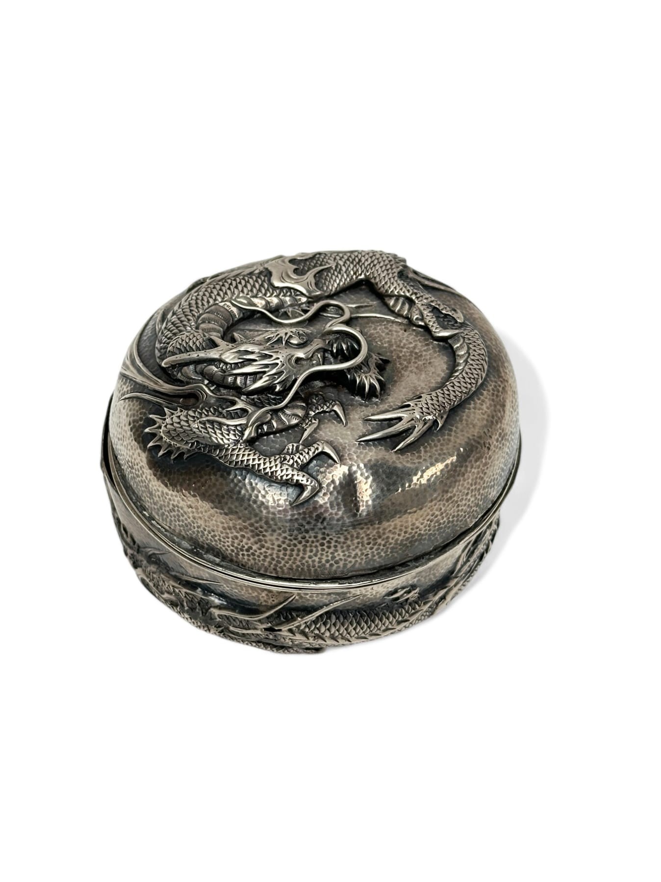 CHINA, 20th century Silver box (min. 800) featuring two dragons in relief on a hammered background. Mark under the base. Diameter : 9 cm Weight : 186 grammes
