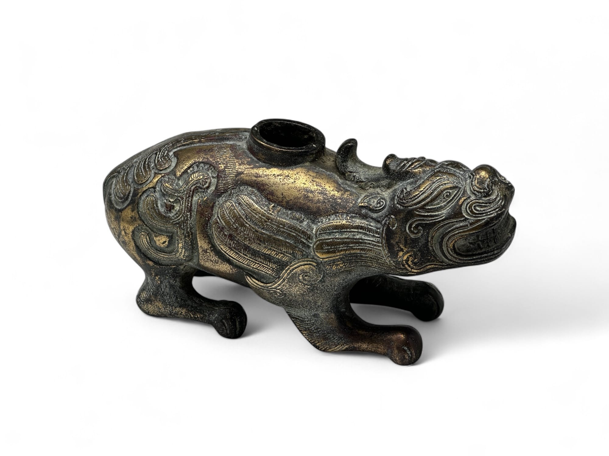 CHINA, in the style of the Yuan Ming dynasty Bronze ritual vase with golden highlights featuring a Xizun chimera. L : 21,5 cm Expert : Johanna Blancard de Léry