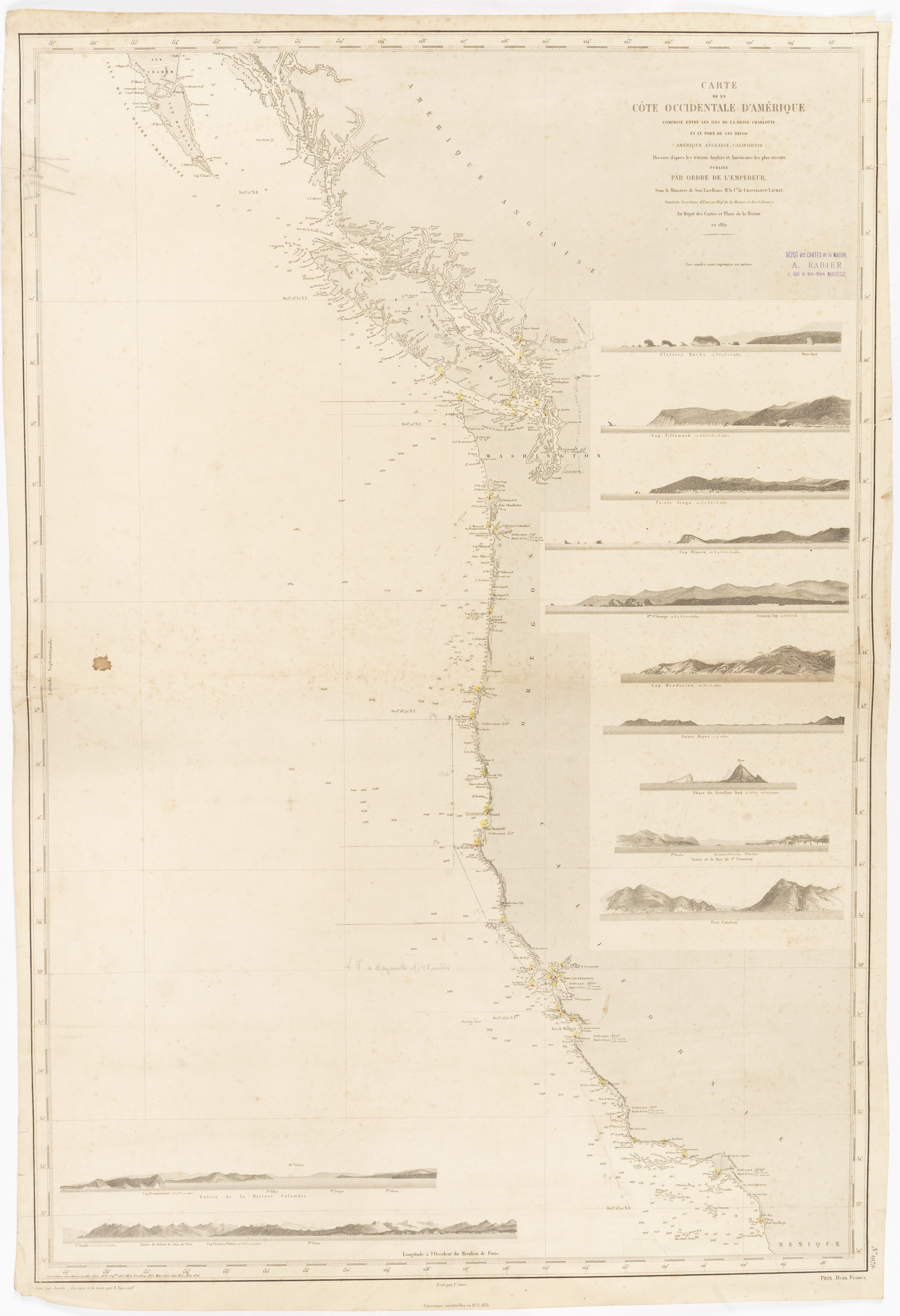DEPOT OF NAVAL MAPS AND PLANS. Carte de la côte occidentale d'Amérique comprise entre les iles de la Reine Charlotte et la port de San Diego. Paris, Dépôt des Cartes et Plans de la Marine, 1862. Printed in color Median fold, foxing, ink stain to left along fold. Lighthouses colored yellow and red at the time. Violet stamp at top of map: "Dépôt des Cartes de la Marine / A. Rabier /4, quai de Rive Neuve Marseille". 910 x 620 mm