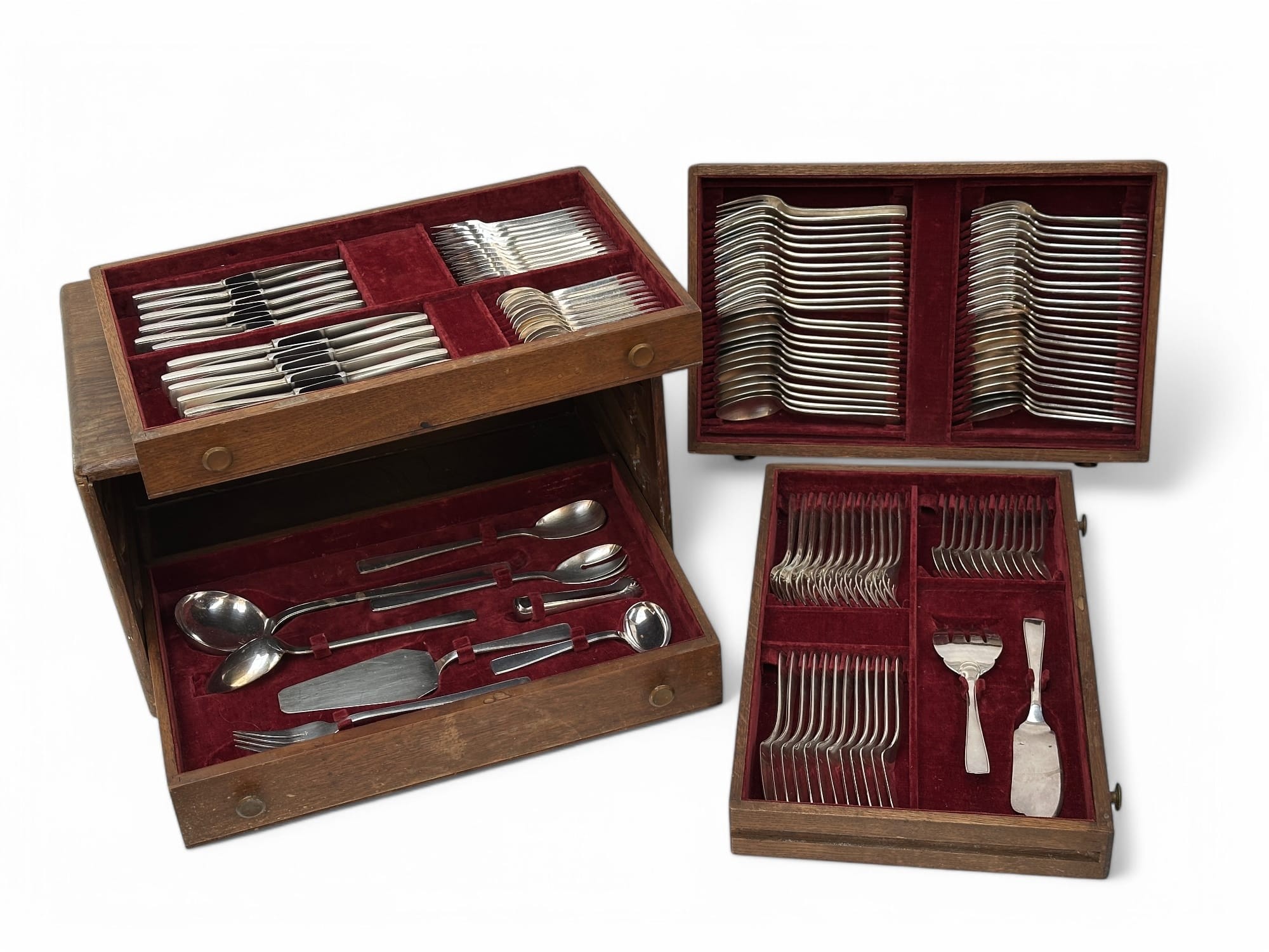 ERCUIS 141-piece silver-plated filet-style cutlery set. Comprising in sets of twelve, table knives, fish knives, fruit knives, table forks, dessert forks, fish forks, dessert forks, soup spoons, dessert spoons, eleven sherbet spoons, salad servers, a ladle, a pie server, a stew spoon, a sauce spoon, sugar tongs, a serving fork and a pair of serving spoons. Pieces marked Ercuis Presented in a wooden case with four drawers lined with red velvet Case: 31 x 52 x 34 cm