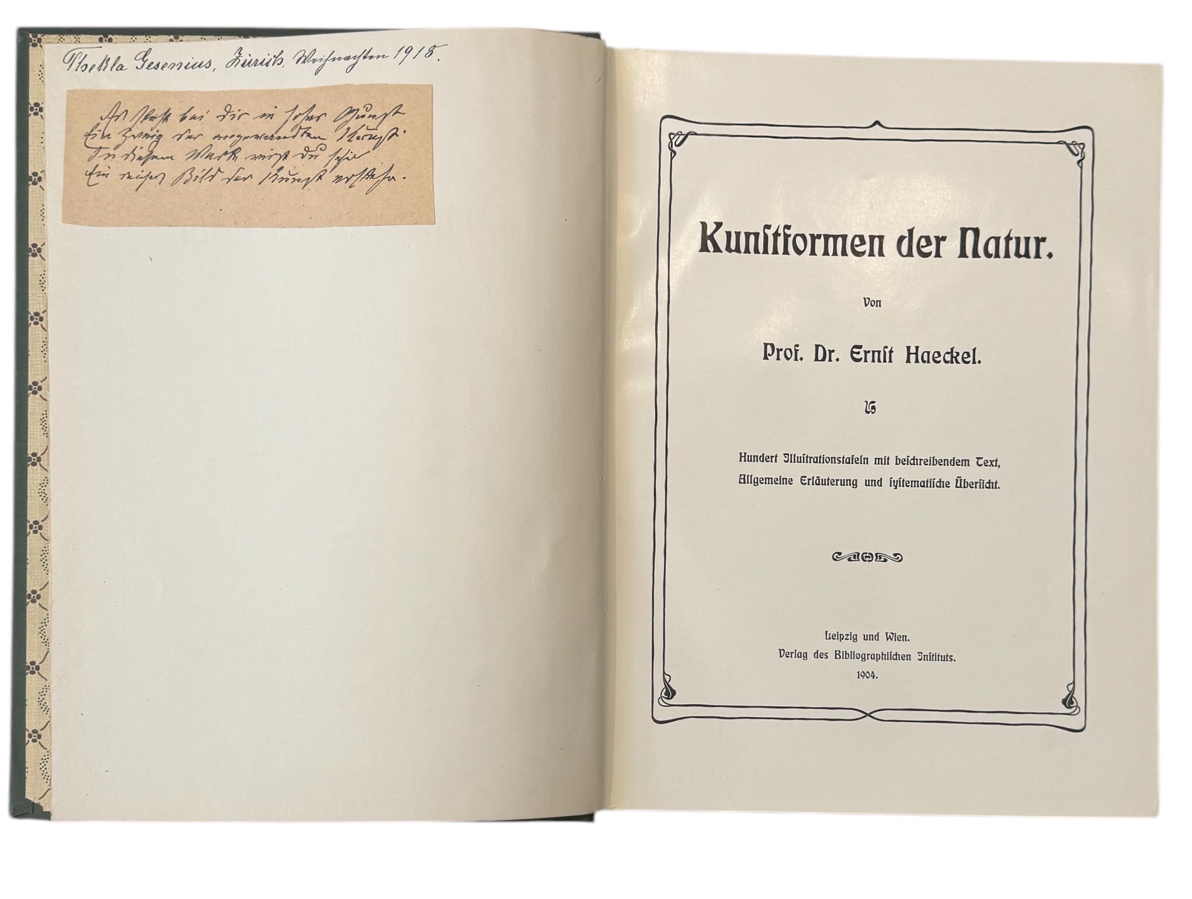 Small folio, first edition illustrated with 100 numbered plates in black and color, some with serpents showing the contours of the subjects depicted. Complete with 51-page final supplement. This is the first one-volume edition of Haeckel's plates, which first appeared in issues from 1899 to 1904.