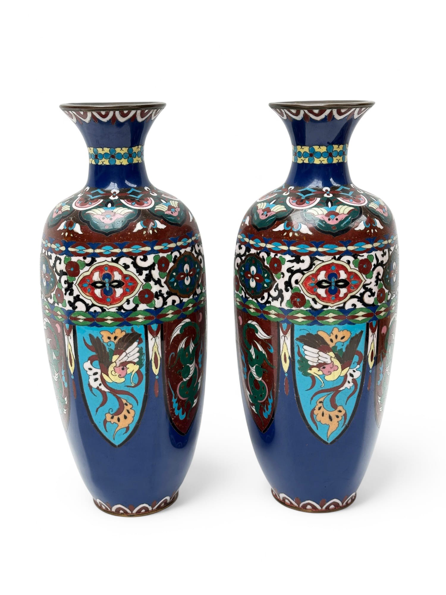 JAPAN, 1st half of the 20th century Pair of cloisonné enamel vases decorated with plant motifs and friezes on a blue background Height: 37 cm Small dents, bumps