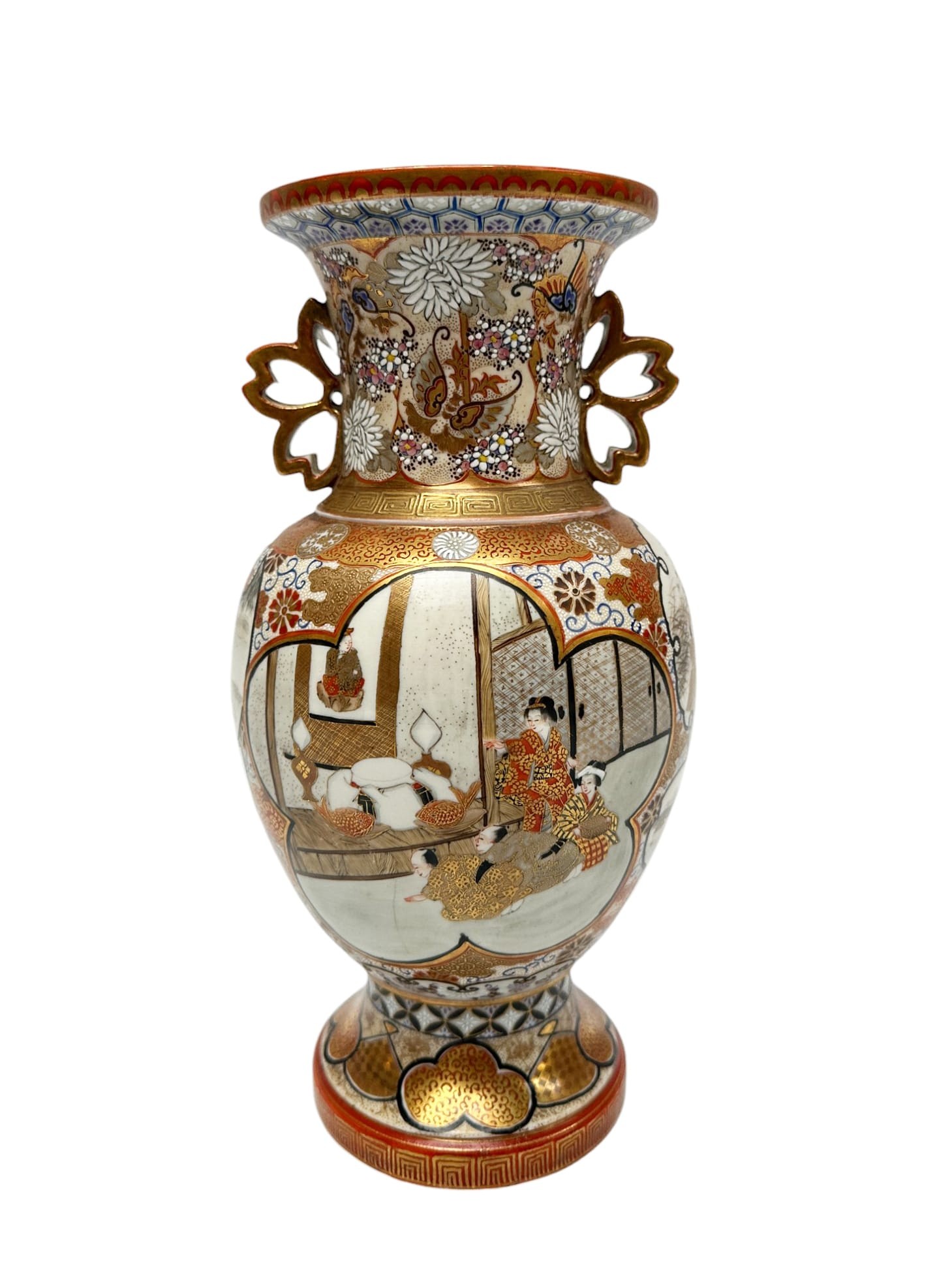 JAPAN, 20th century Baluster-shaped vase decorated in gold and polychrome with Geisha figures dancing in cartouches on a beautiful red and gold background and decorated with butterflies and chrysanthemums. Calligraphy. Height: 23.5 cm