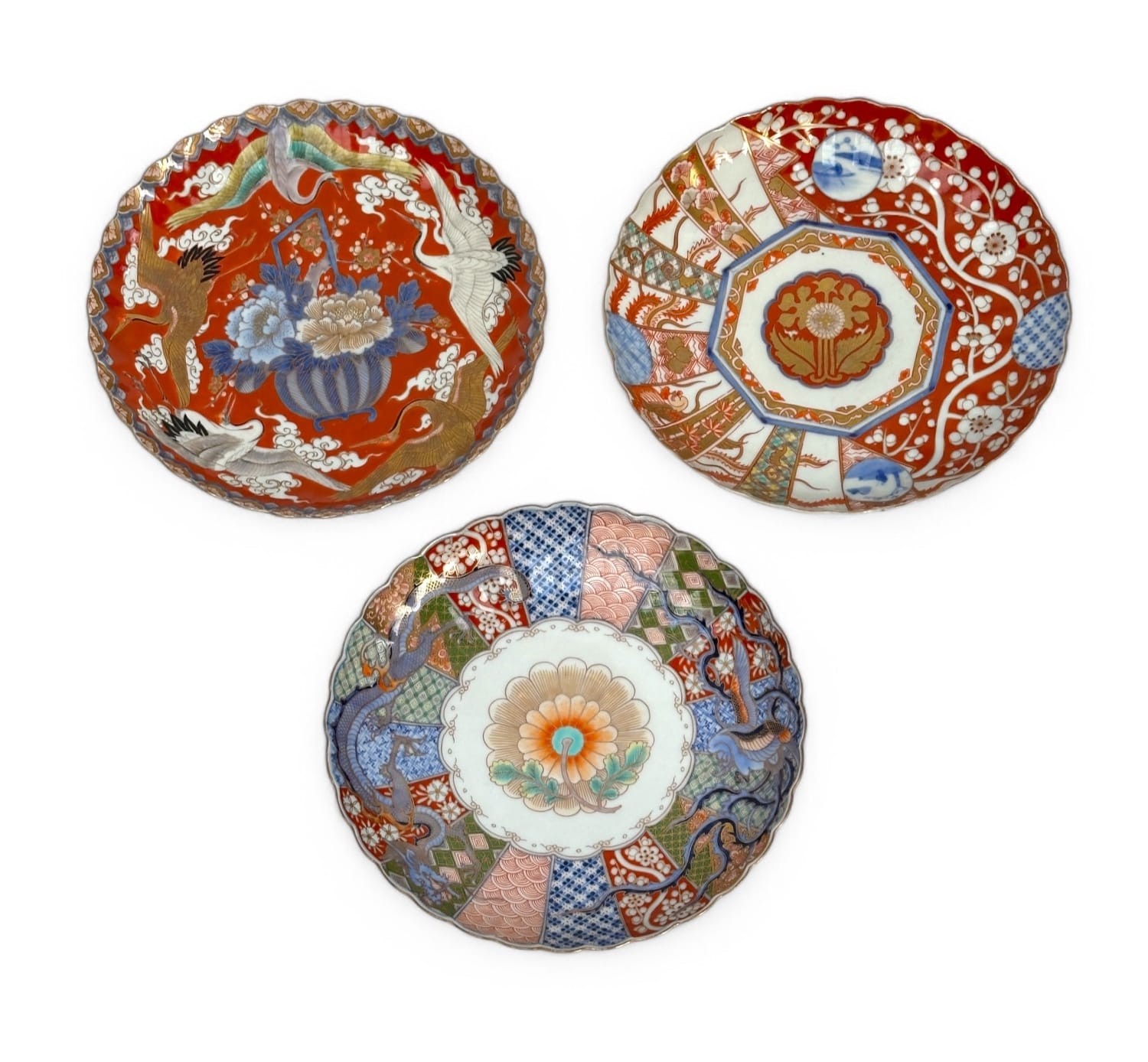 JAPAN, 20th century Set of three Imari porcelain plates, one decorated with storks, one with dragons and one with vegetal motifs Diameter: 21.5 cm