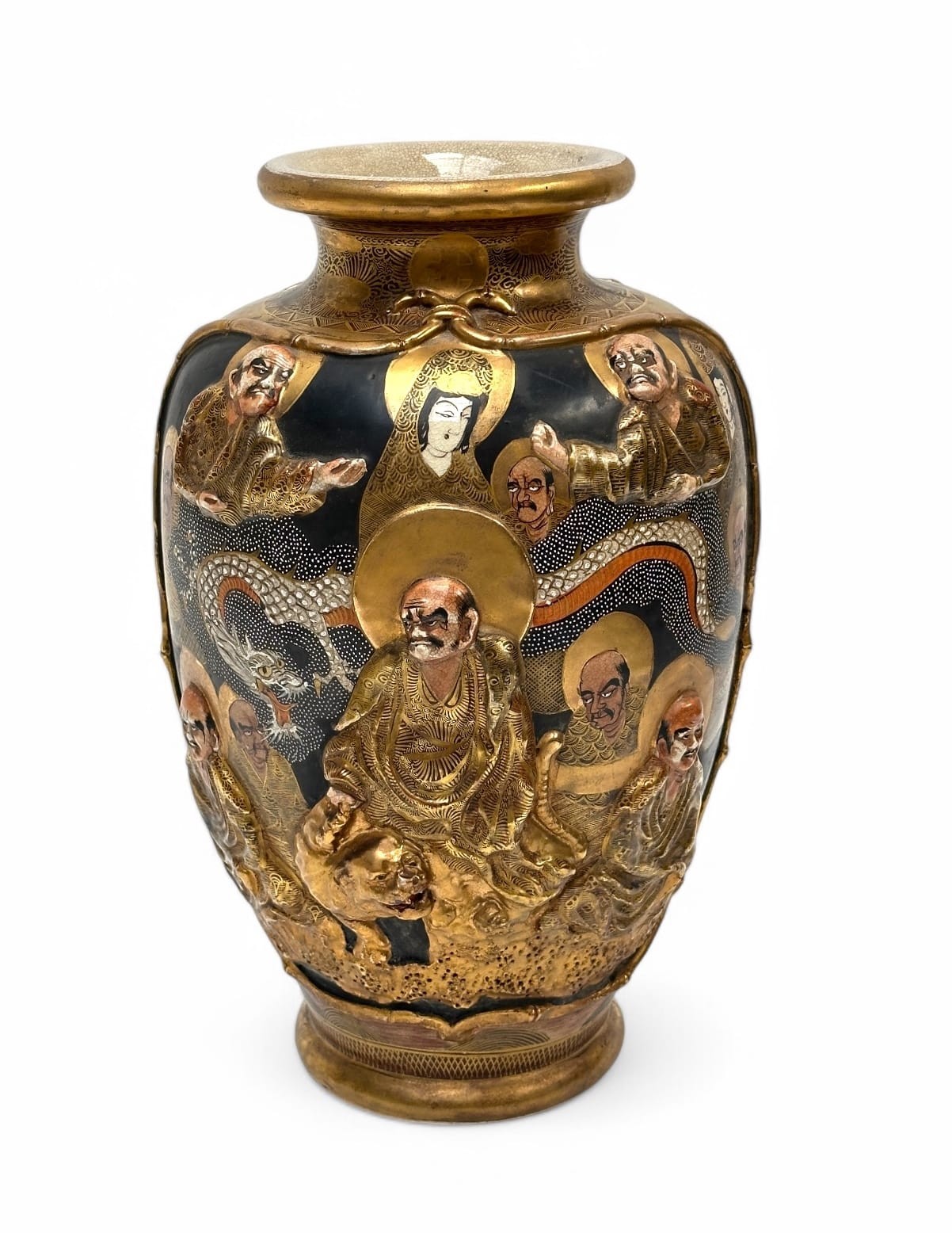 JAPAN, late 19th century Satsuma cracked porcelain vase with gold decoration on a black background, in slight relief, of figures on clouds surrounded by dragons on one side and, on the other side, a court scene in a garden H : 36 cm Provenance: according to family tradition, brought back from Asia by the current owner's great-grandfather, who worked in the merchant navy at the time.
