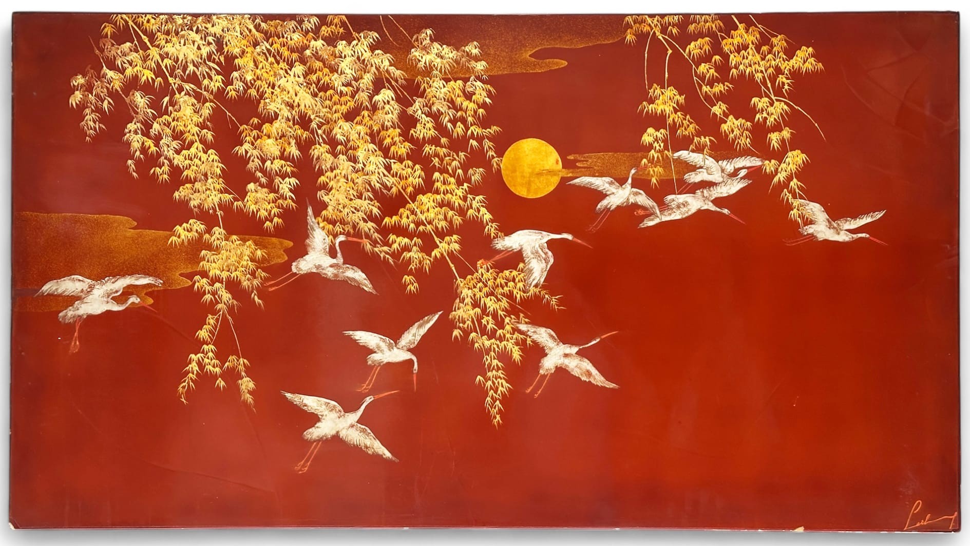 Lê Thy (1919-1961) Storks in flight in front of the sun Red and gold lacquered wood panel Signed lower right 68 x 124 cm