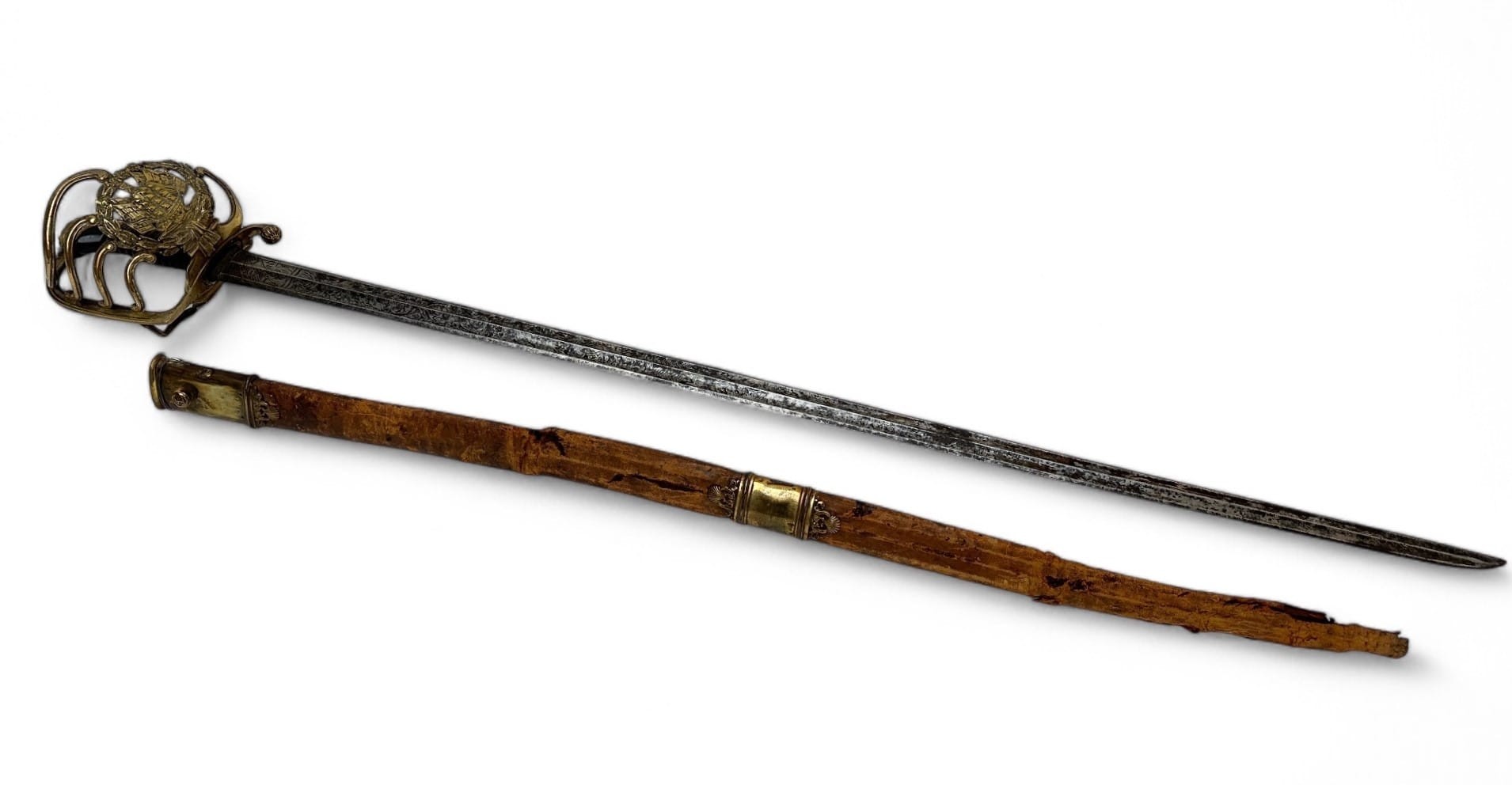 Luxurious saber with battle hilt. Brass mounting. Chased cap with scroll decoration and long tail. Jointed bow with four small branches connecting the central plate depicting a warship against a background of six pennants and a lictor beam. On the inner side, a second branch connects a second pallet and curved quillon ending in a bud. Horn spindle, watermark missing. Strong blade with two half-engraved gutters decorated with interlacing, eagle, lictor beam and trophies of arms. Leather scabbard with three fittings (missing bolt) ME. Total length: 111 cm. First half of the 19th century. Composite Expert : Alban Degrave