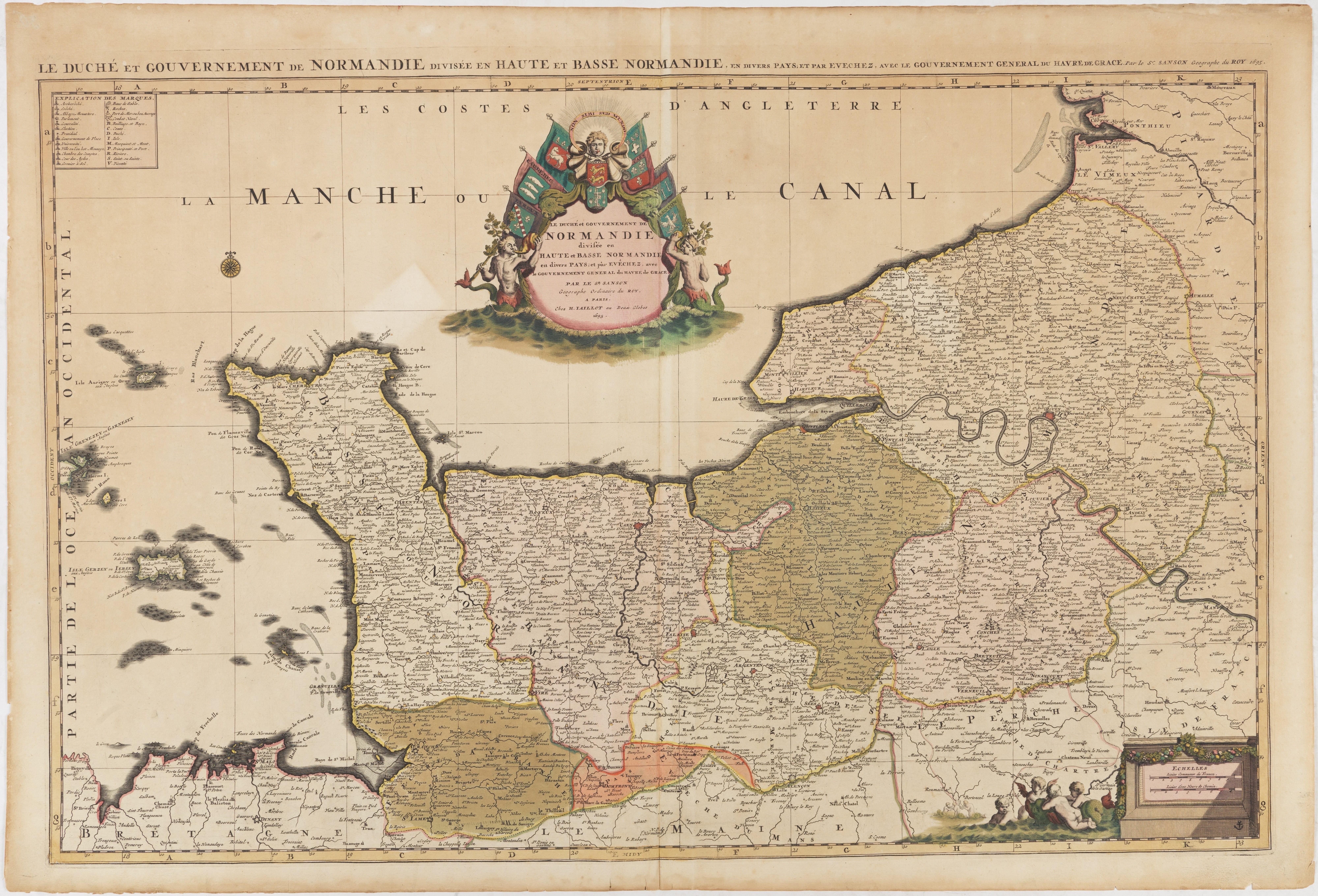 MORTIER, P. / JAILLOT, H. Le Duché et Gouvernement de Normandie divisée en Haute et Basse Normandie. Amsterdam, 1695. Fine contemporary col. Superb contemporary col. with gold highlights. Paper slightly browned. 885 x 565 mm Large map of Normandy published in the Atlas Nouveau forgery by Mortier in 1696. Also includes the Channel Islands. Adorned with a superb allegorical cartouche. - Pastoureau, Les Atlas Français XVIe-XVIIe Siècle, Jaillot 1E, [296] Expert : Béatrice Loeb-Larocque