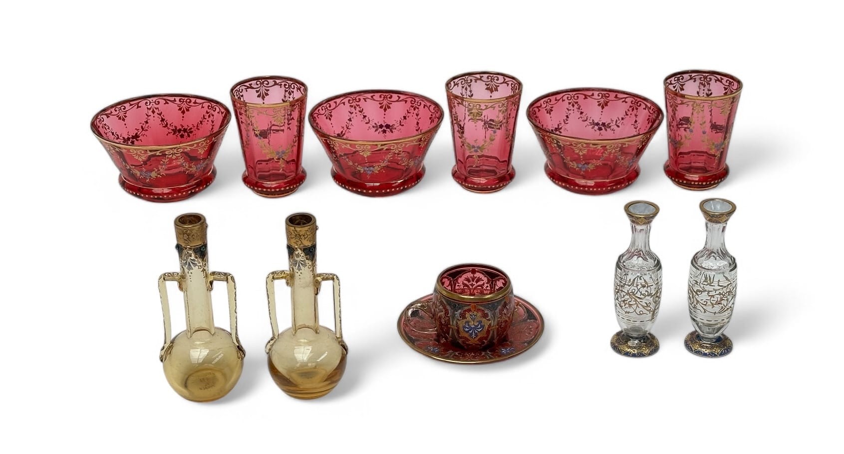 MOSER Set of colored enameled crystal pieces with gilding, including a pair of footed flasks with foliate decorations, a pair of handled flasks and a decorated cup and saucer. Signed and numbered below A suite of three bowls and a suite of three crystal goblets in the same taste are included. H vials with handles: 14 cm Diam. bowls: 13 cm approx.