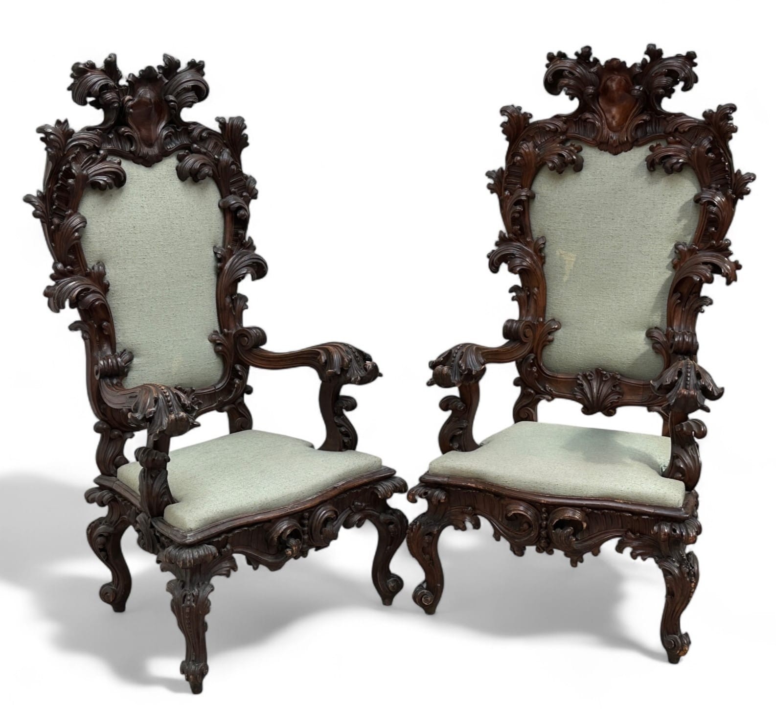 Pair of ceremonial armchairs in richly carved softwood with Baroque decor. Cambered legs ending in scrolls. They are adorned with large acanthus leaves, shells and cut leathers. The jagged top of the backrest is decorated with a cartouche. Frame upholstery. Italian work of the 19th century. 163 x 81 x 67 cm Slightly missing Expert : Cabinet Martel et Lencquesaing