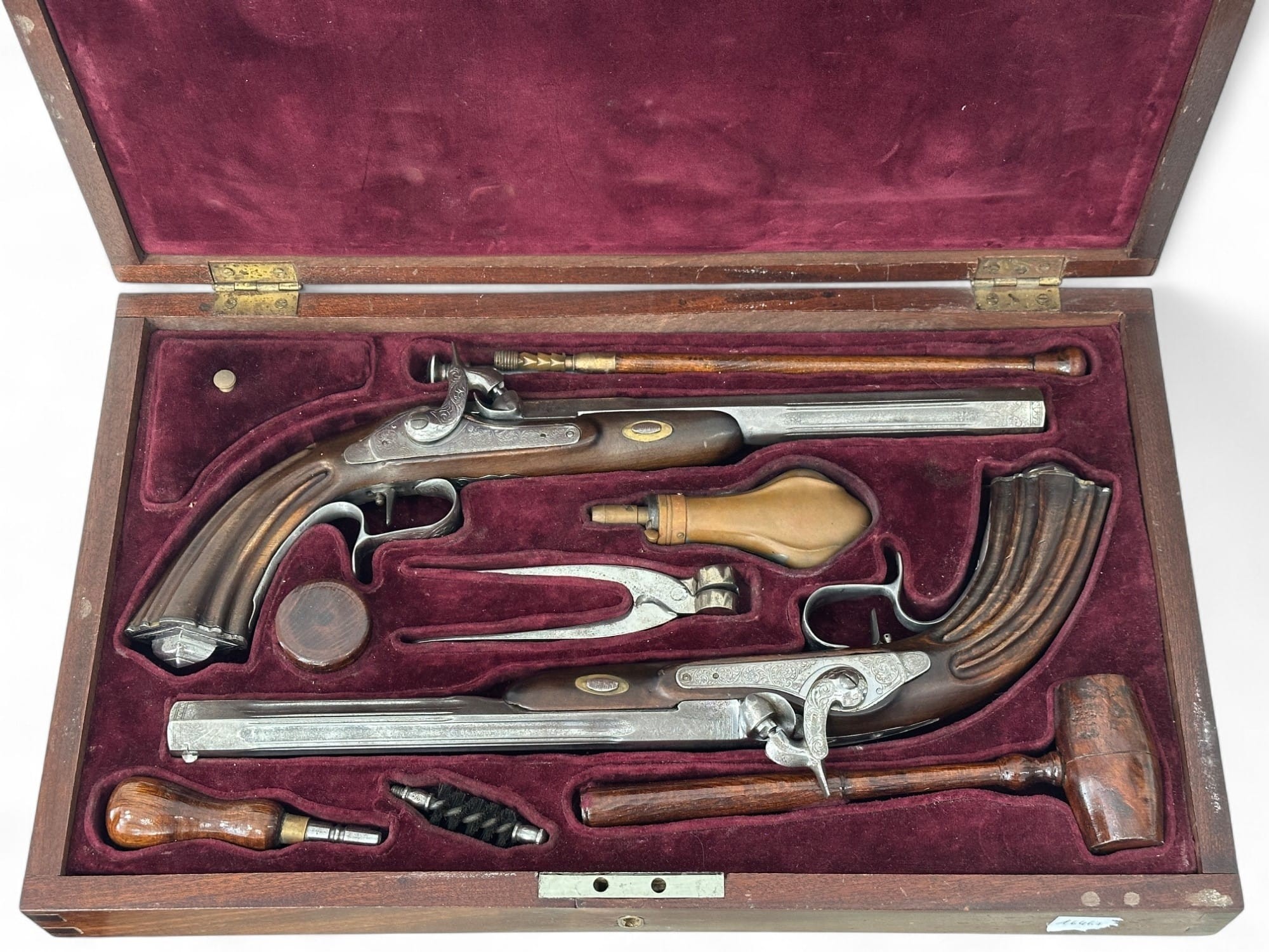 Pair of dueling pistols in cassette. Percussion front locks. Hollow rifled barrels with sights. Carved walnut stocks with iron fittings. Good mechanics. Black powder guns in the style of the 1850s/60s. Probably Spanish production circa 1970. Wooden case lined with red velvet. Complete with accessories, mallet, pulverin, bullet mold, chimney cleaner, primer box and cleaning rod. Category D weapon Expert : Alban Degrave