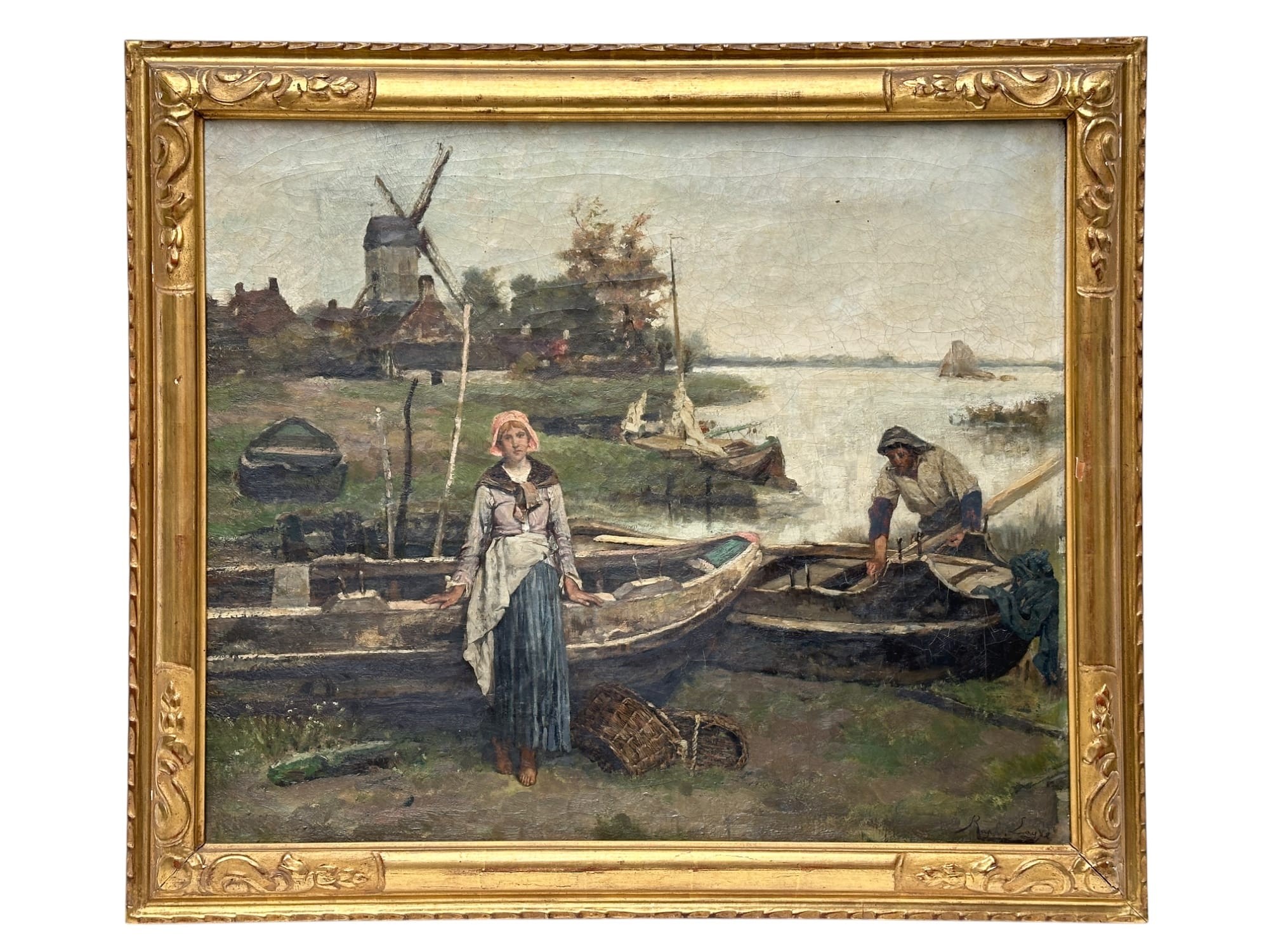 Raphaël LAGYE (1862-1952) The Dutch fisherman and his wife in front of their boats Oil on canvas Signed lower right 56.5 x 67 cm
