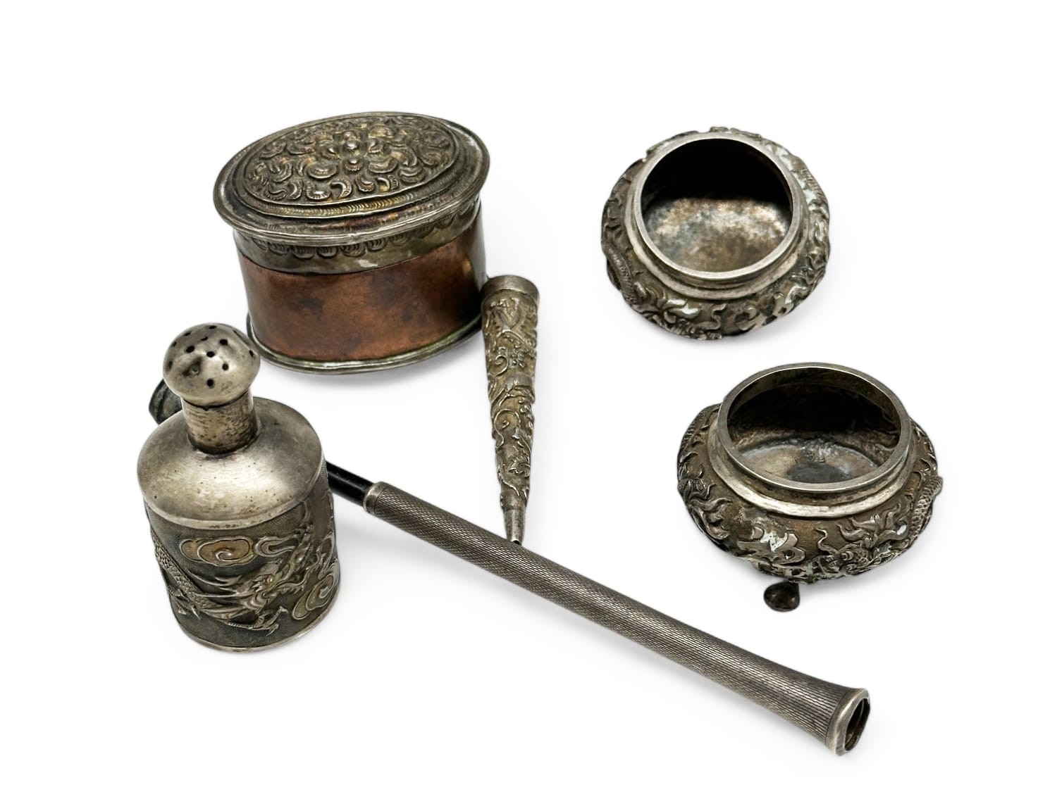 Set of silver display items (800) including a guilloche cigarette lighter, a dragon salt cellar, a cachet decorated with animals and plant motifs, two tripod dragon salt cellars (one foot broken) and a box (copper, silver lid only). L cigarette lighter: 15 cm Gross weight (silver components): 110.3 grams Wear marks