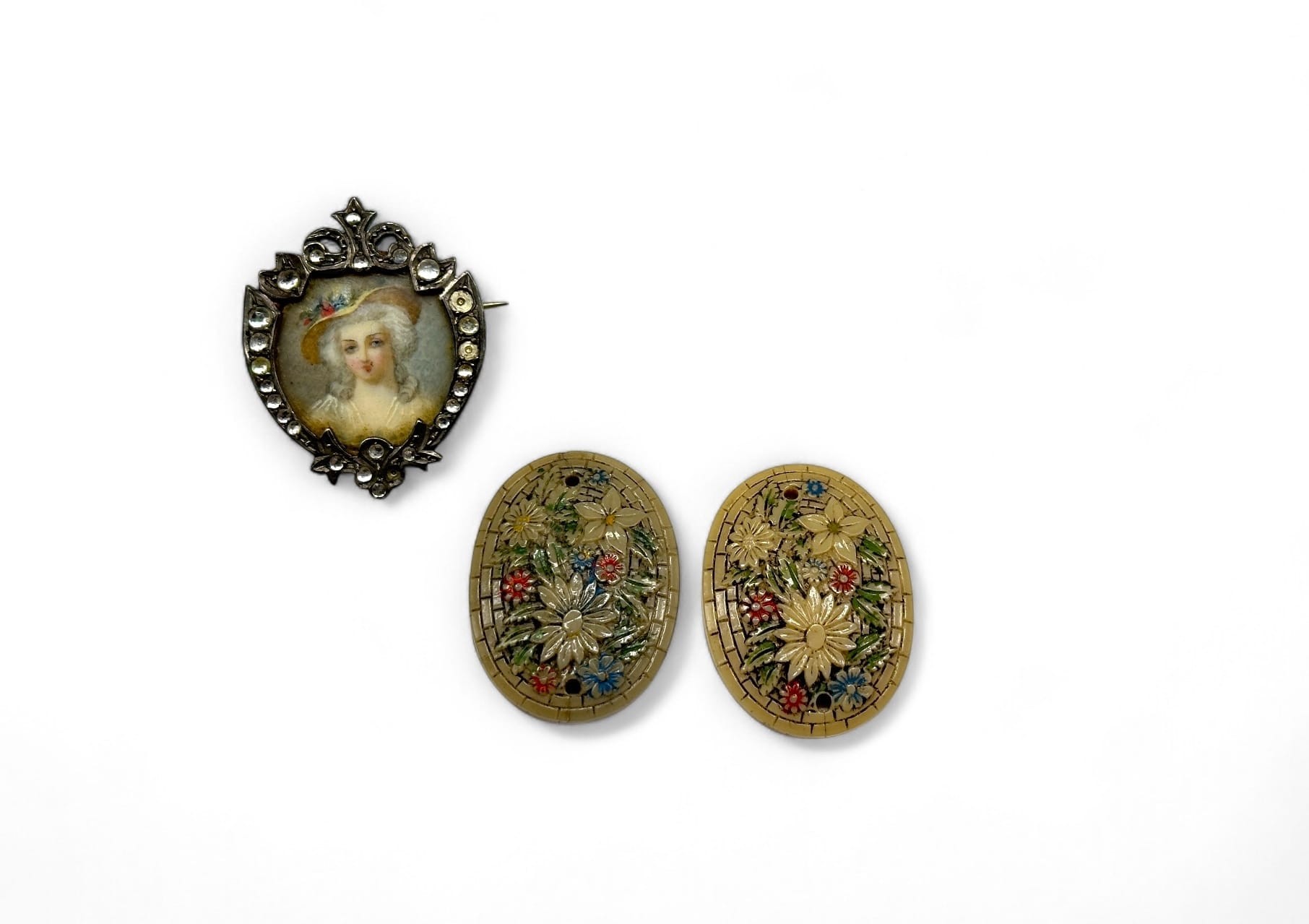 Silver (800) picture-holder brooch in the form of a coat of arms surrounded by white stones, painted with a portrait of a woman wearing a hat 32 x 26 mm Gross weight: 5.8 grams Attached are a pair of ceramic medallions decorated in light polychrome relief with flowers on a pavé background, pierced for fastening. 30 x 22 mm each