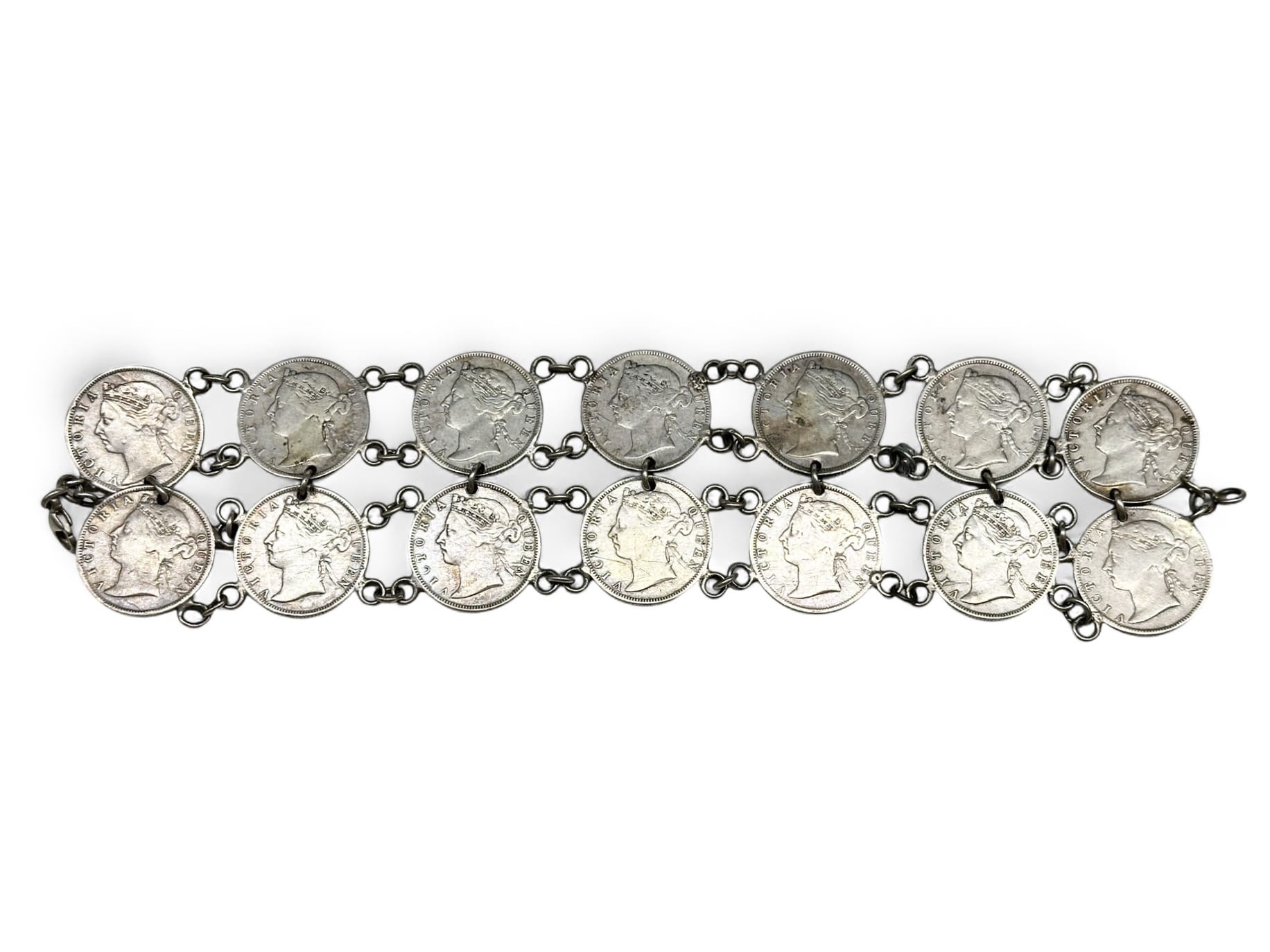 Silver coin bracelet (800) including 14 coins of 20 cents between 1874 and 1901 with the profile of Queen Victoria Length: 20 cm Gross weight: 85.5 grams