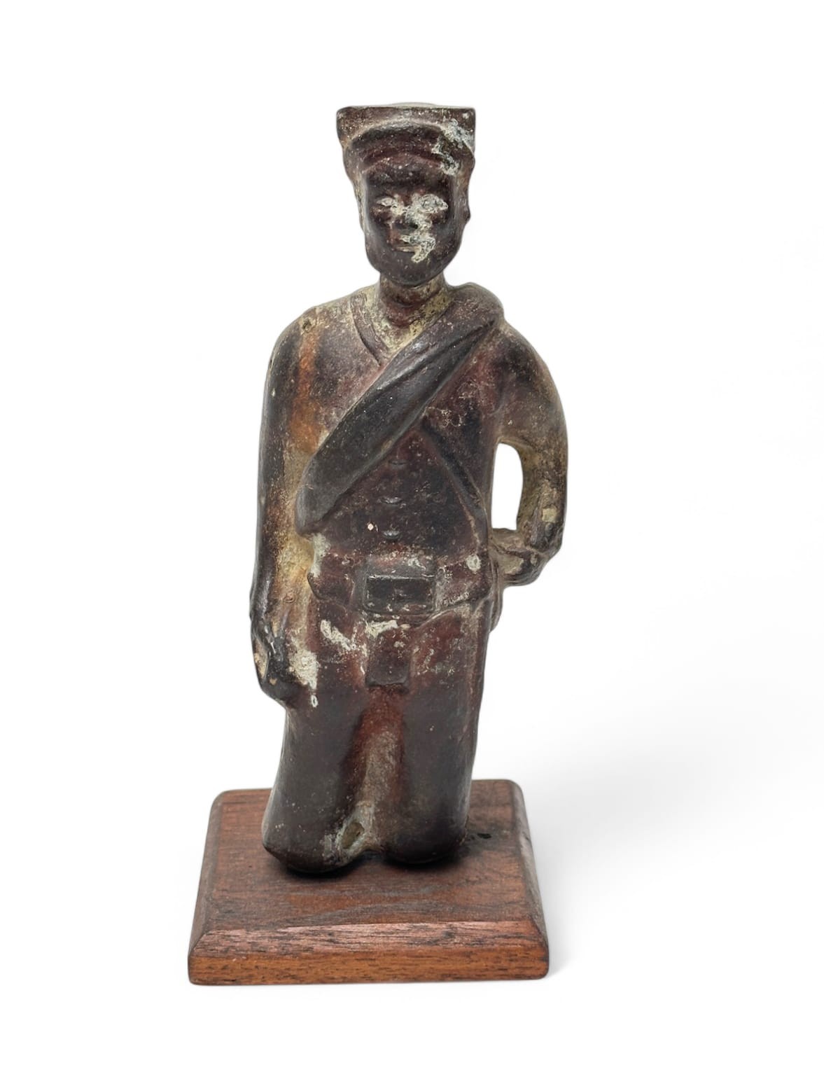 SOUTH CHINA, 20th century Statuette of a standing warrior in cast iron Traces of old gilding H: 19.5 cm (excluding wooden base) Expert : Johanna Blancard de Léry