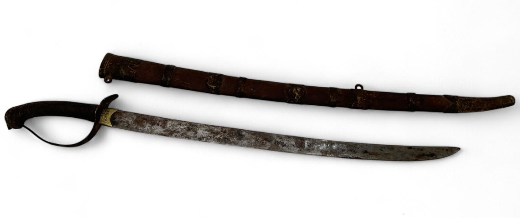 Southeast Asia. Short saber, bronze mounted. Chased fuse decorated with a face. Flat joint arc forming the plate. Locally-made curved blade. Wooden scabbard with cut brass fittings. Total length: 68cm Early 20th century. Expert : Alban Degrave