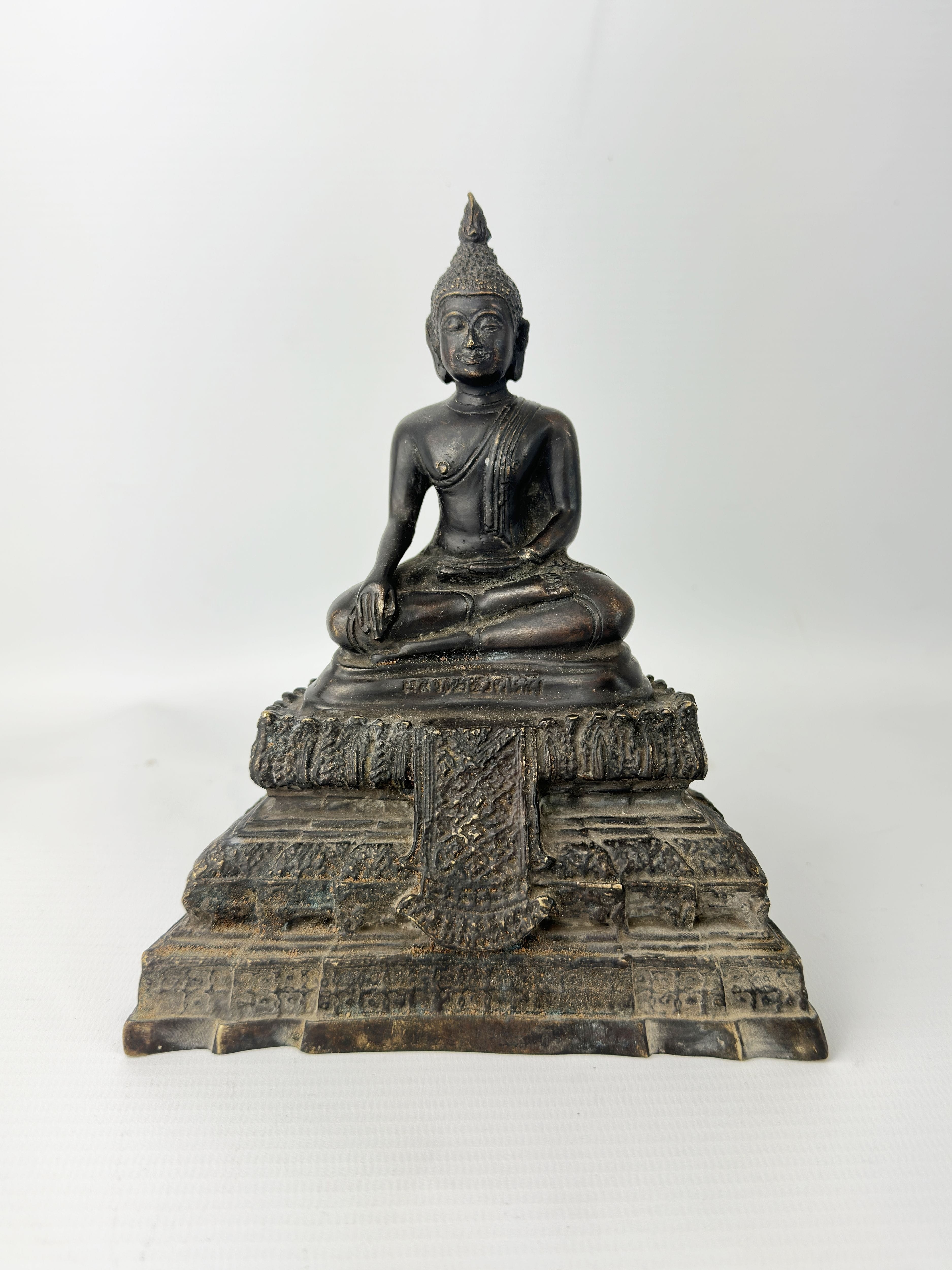 THAILAND, 19th/20th century. Bronze Buddha statuette, seated in padmasana, hands in bhumisparça mudra. The tip of the ushnisha is slightly twisted. H. 17.7 cm.