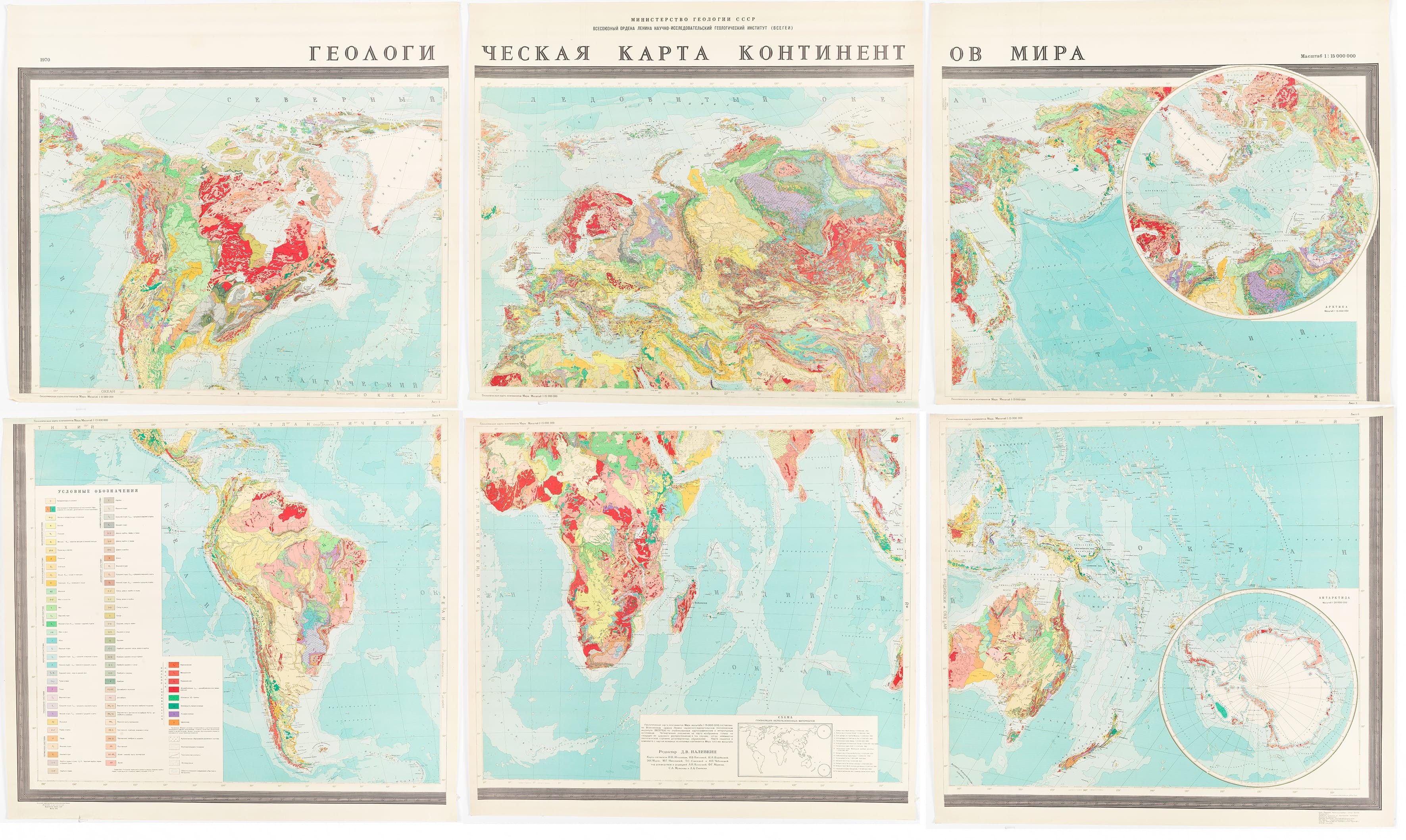 VSEGEI. Geological map of the continents. Leningrad, D.V. Nalivkin, 1971/1973. Color printed map in six unattached sheets, each sheet measures approx. 72.5 x 81 cm. Very good condition.