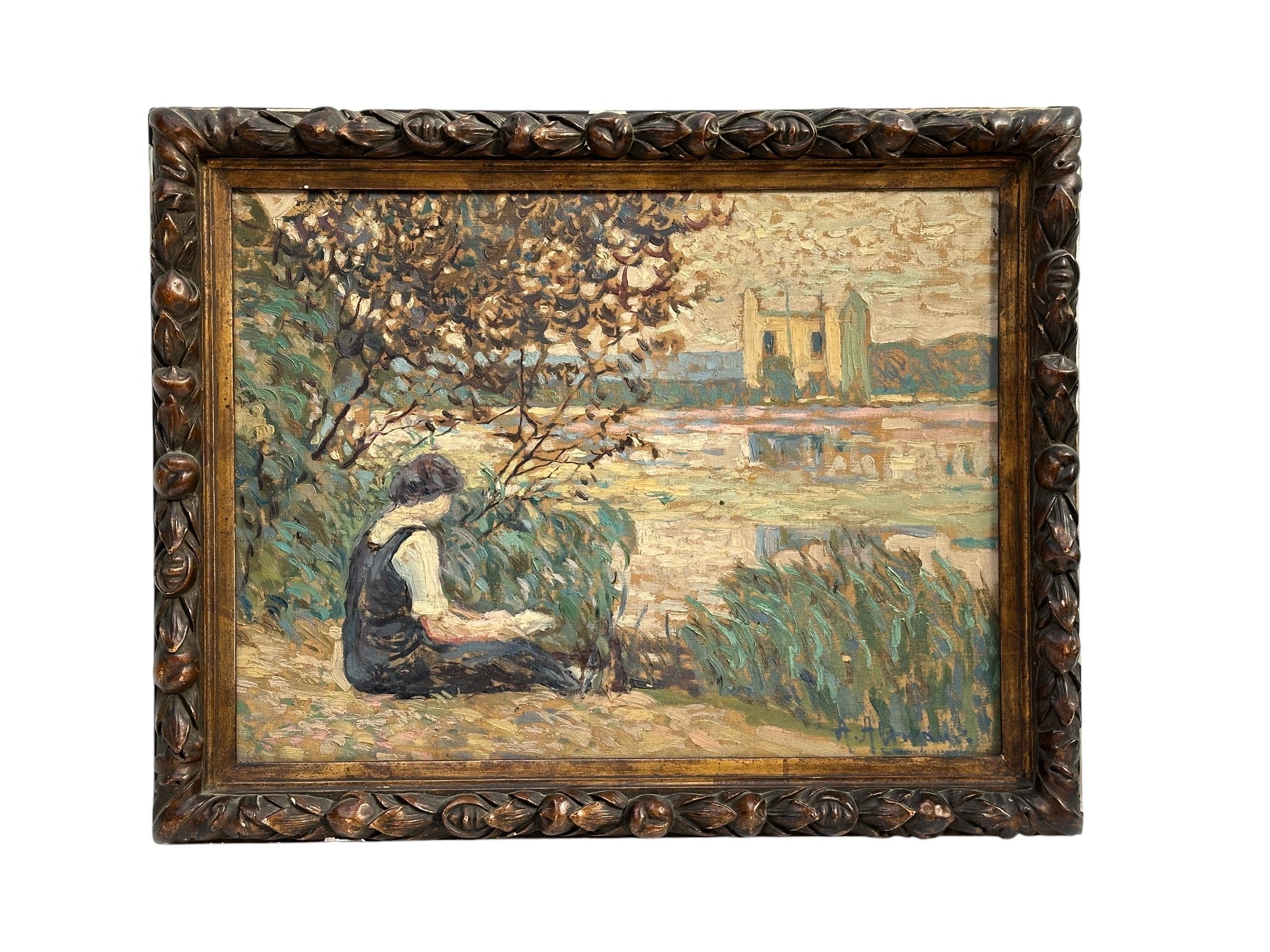 Alexander ALTMANN (1878-1932) Woman by the water Oil on canvas Signed lower right 46 x 61 cm Provenance: Given by the artist to the grandparents of the current owners. They had fled Odessa during the revolt of the sailors of the battleship Potemkin in the summer of 1905. They gave the artist shelter on several occasions, and the painting here depicts Mrs. E.K. on the banks of the Chevreuse. Expert : Raphaël Maket