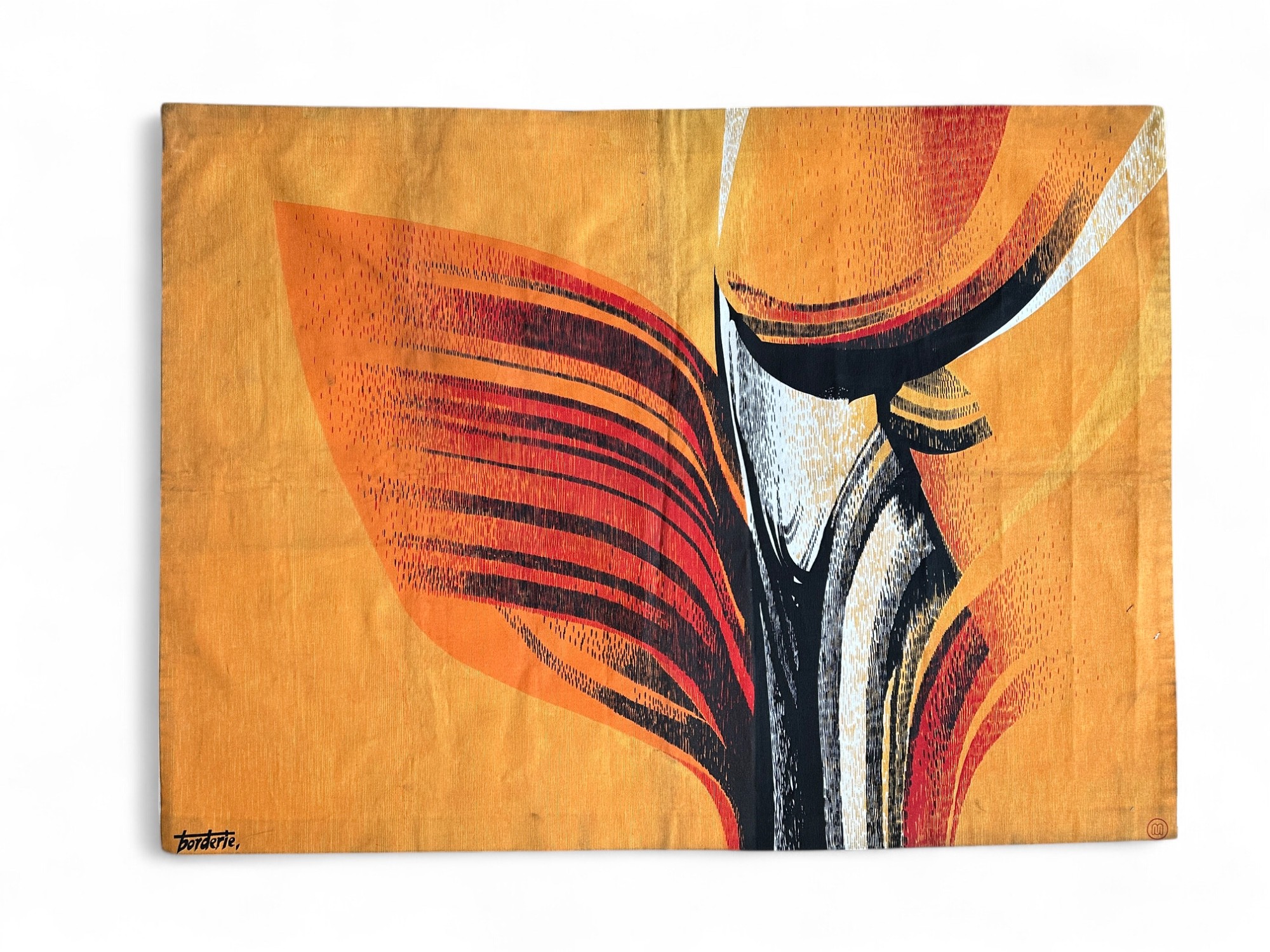 André BORDERIE (1923-1998) from a carton Tapestry, circa 1960, with abstract polychrome decor on orange ground Signed Borderie in the weft Bearing a Bolduc on the back Edition La demeure 108 x 147 cm approx. Expert : Romain Coulet