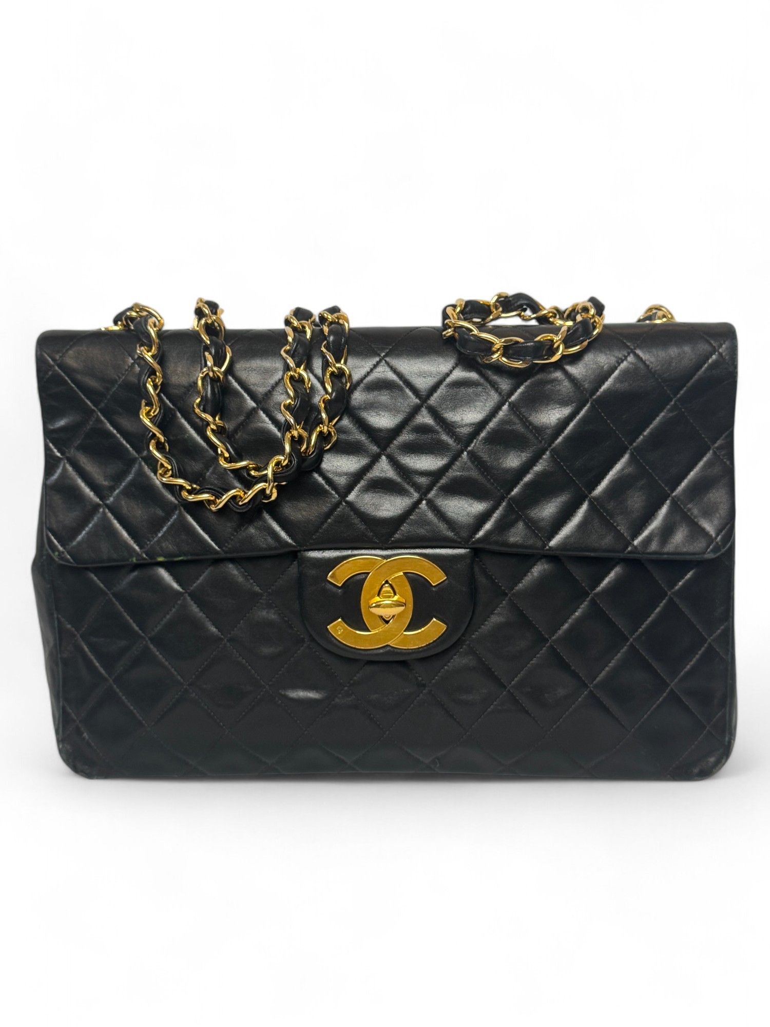 CHANEL Jumbo black quilted lambskin maxi bag, burgundy lambskin lining, gold-plated metal jewelry, transformable double chain handle. Circa 1994. Used condition, heavy wear to corners, traces on flap, missing screw on clasp plate. Dustbag. 34 x 22 x 10 cm approx. Expert : Jérôme Lalande