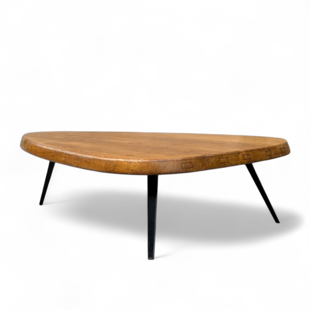 Coffee table, circa 1957, with a thick, free-form ash wood top punctuated by false tongues and circular covers concealing threaded rods, set on three tapered legs in folded and welded black-lacquered sheet steel.