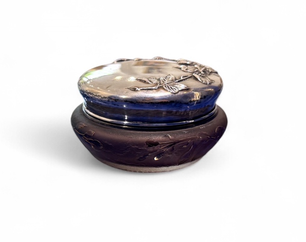 DAUM - NANCY & LAGRIFFOUL & LAVAL (silversmith) Bonbonnière with shouldered circular body and neck encircled by a silver rim, with silver lid. Proof in violet glass with acid-etched fuchsia decoration on a frosted ground enhanced with gilding. Signed on the reverse, title and goldsmith's hallmarks on the mount. Height: 6 cm - Diameter: 11 cm Expert : Cabinet Marcilhac