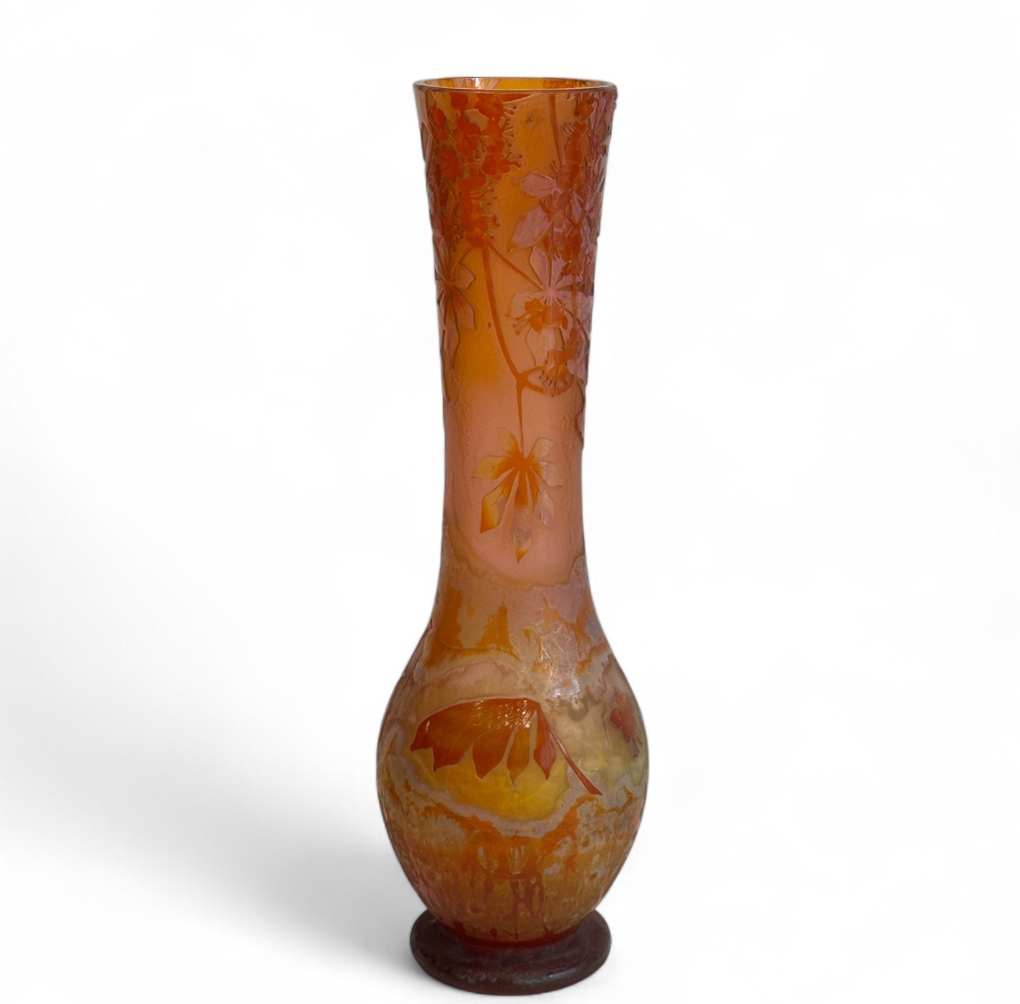 DAUM - NANCY Vase with ovoid body and long conical neck on pedestal. Proof in iridescent blue and orange lined glass on a pink ground. Acid-etched decoration of flowers and chestnut leaves on a frosted background (small chips on the neck, burst firing bubbles, ground-glass neck). Signed and located on reverse. Height: 45 cm Expert : Cabinet Marcilhac