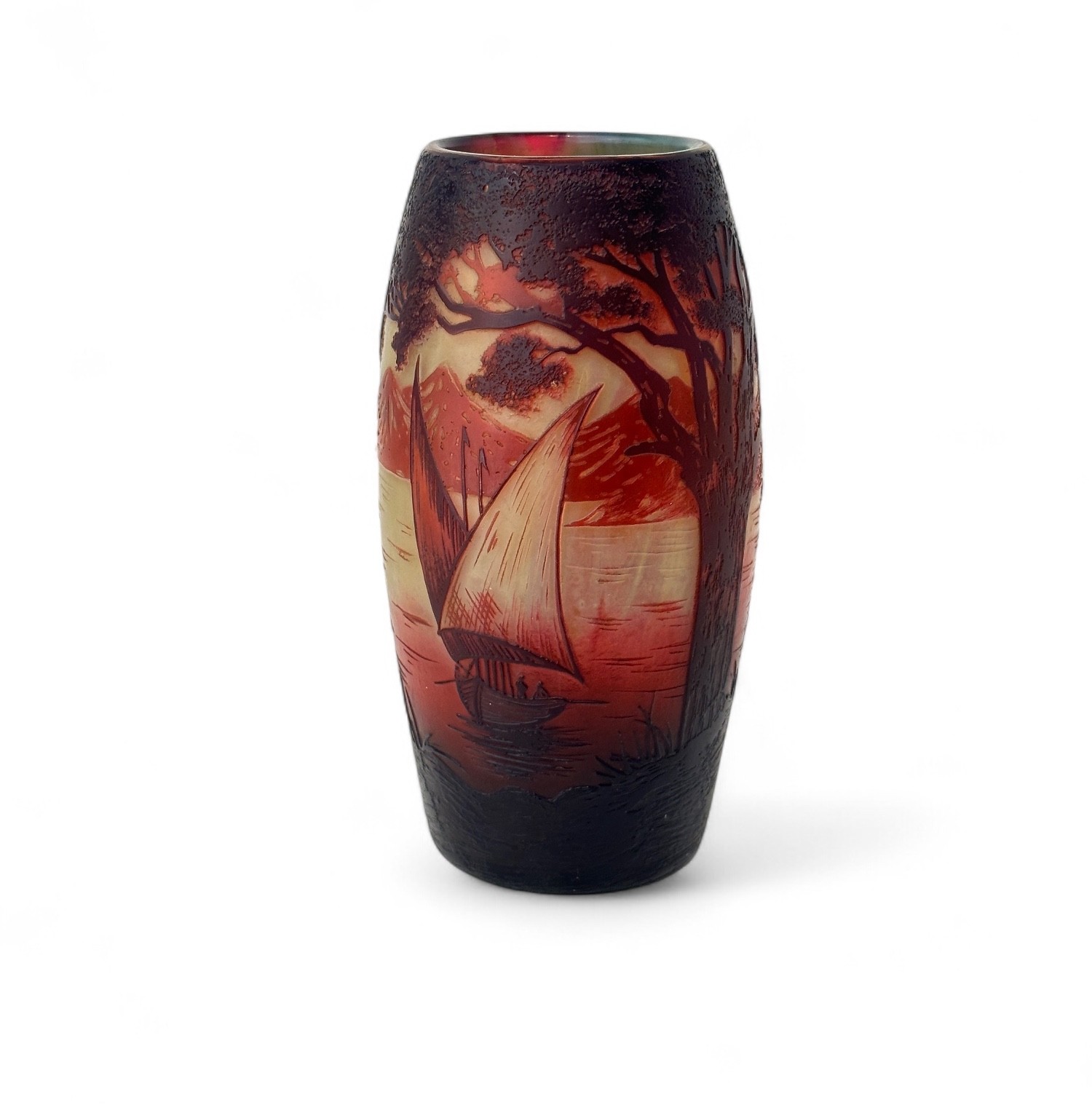 DE VEZ - CRISTALLERIE DE PANTIN Vase with obusal body in purple and red multi-layered glass on a yellow ground. Acid-cameo engraving of boats on a lake bordered by mountains (minor material defects). Signed in the decoration. Height: 15.5 cm Expert : Cabinet Marcilhac