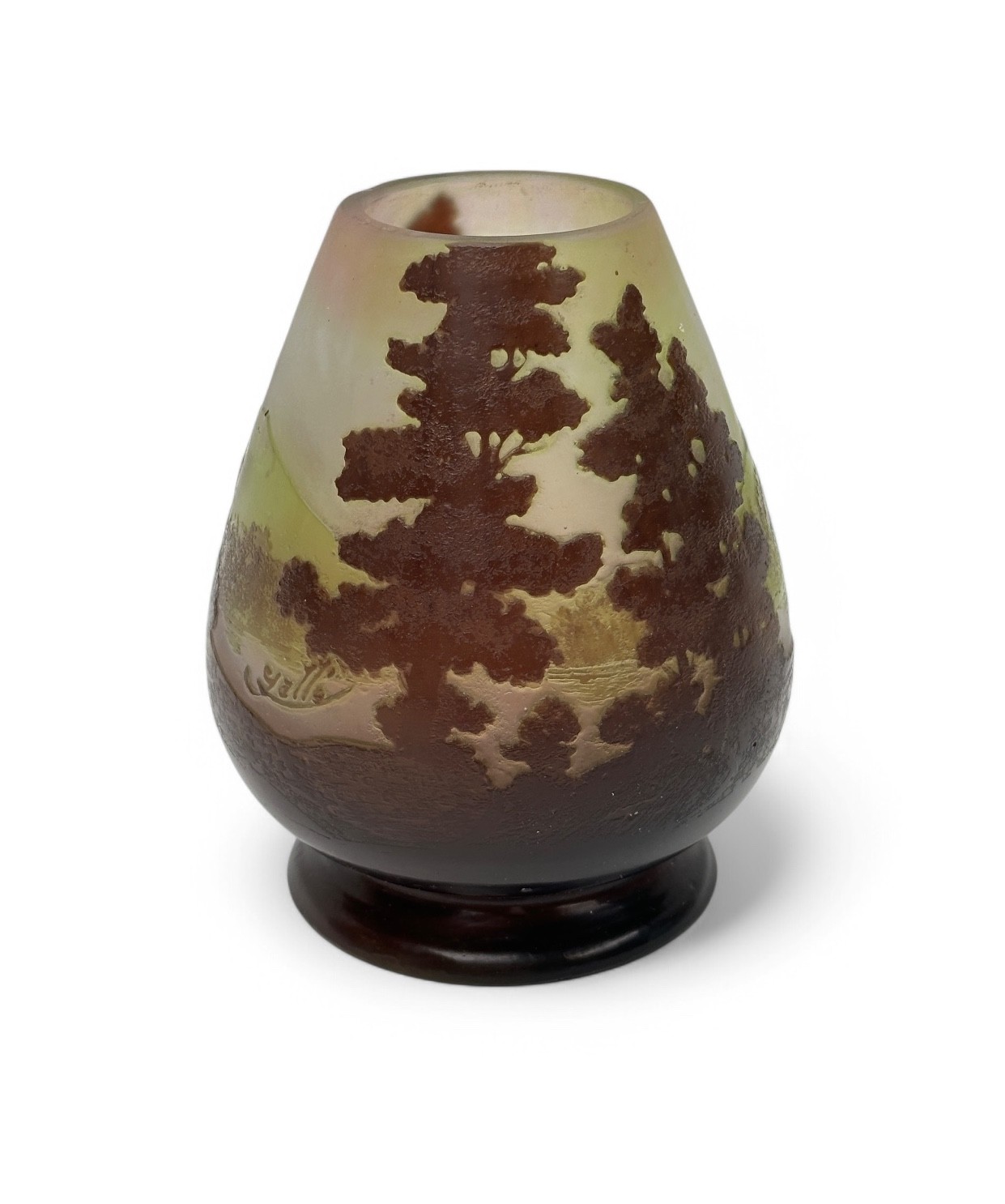 ÉTABLISSEMENTS GALLÉ (1904-1936) Vase with conical body on pedestal. Proof in brown lined glass on a whitish pinkish-green ground. Acid-etched mountain and lake landscape (cut neck, chip). Signed in the decoration. Height Height : 11.5 cm Expert : Cabinet Marcilhac