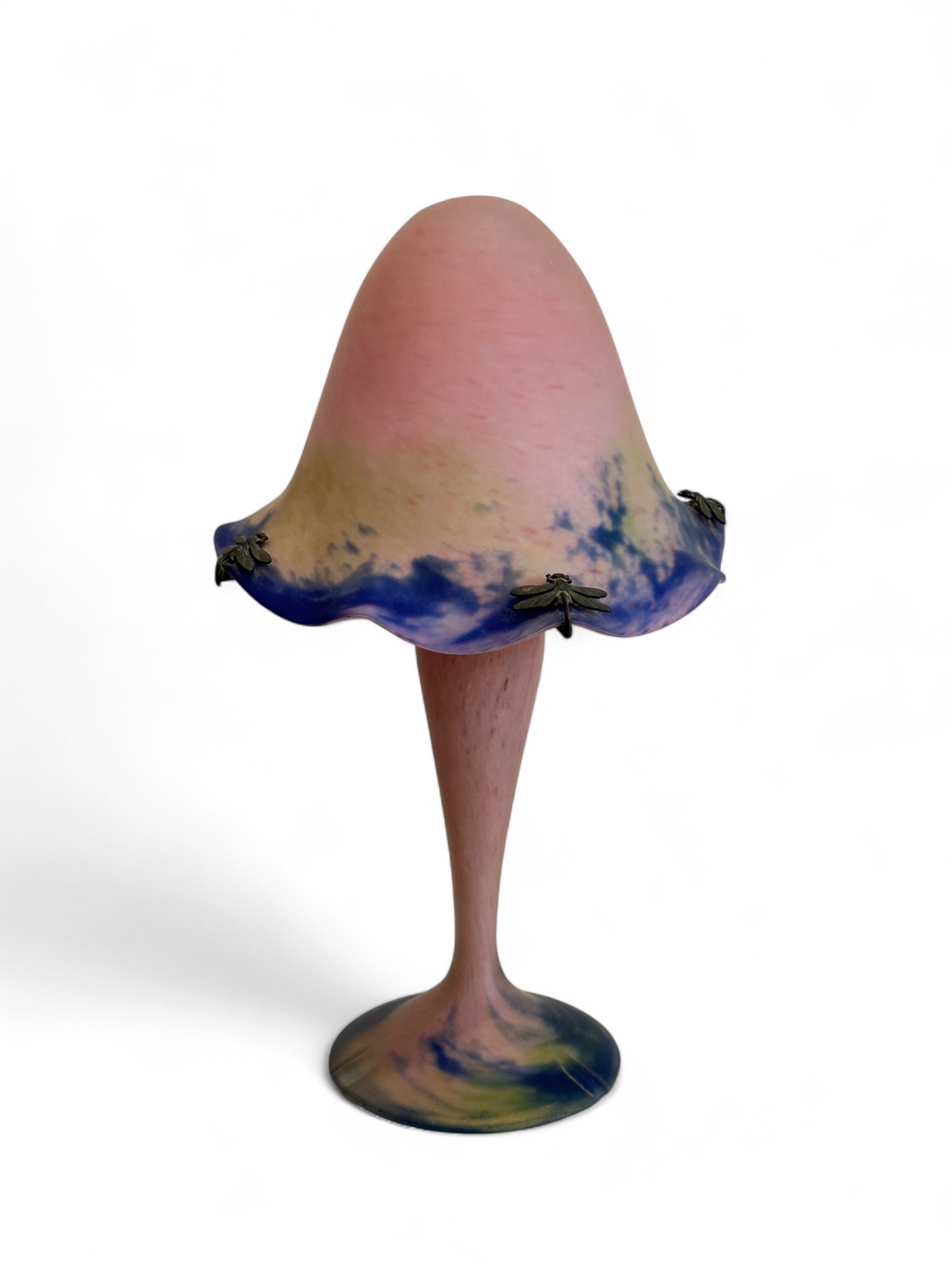 FRENCH WORK Single-light table lamp with baluster base on circular pedestal with three notches and conical shade with scalloped edges. Pink, blue, yellow and green marmorated glass proofs (later electrical system with no guarantee of operation). Blackened metal system with four dragonfly-shaped claws (minor oxidation). Bears a signature Height 39 cm (total) Expert : Cabinet Marcilhac
