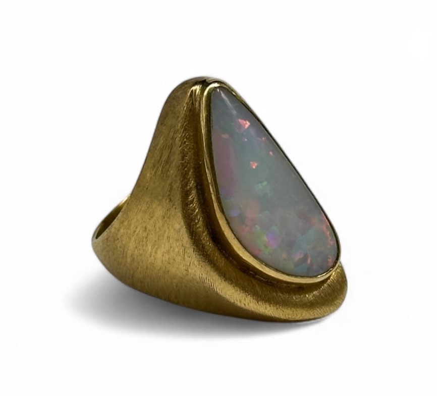 Haroldo BURLE MARX (1911-1991) Freeform ring in yellow gold (750) with fine engine-turned decoration, set with an opal stone Signed on the inside Finger size: 52 Gross weight: 9.2 grams