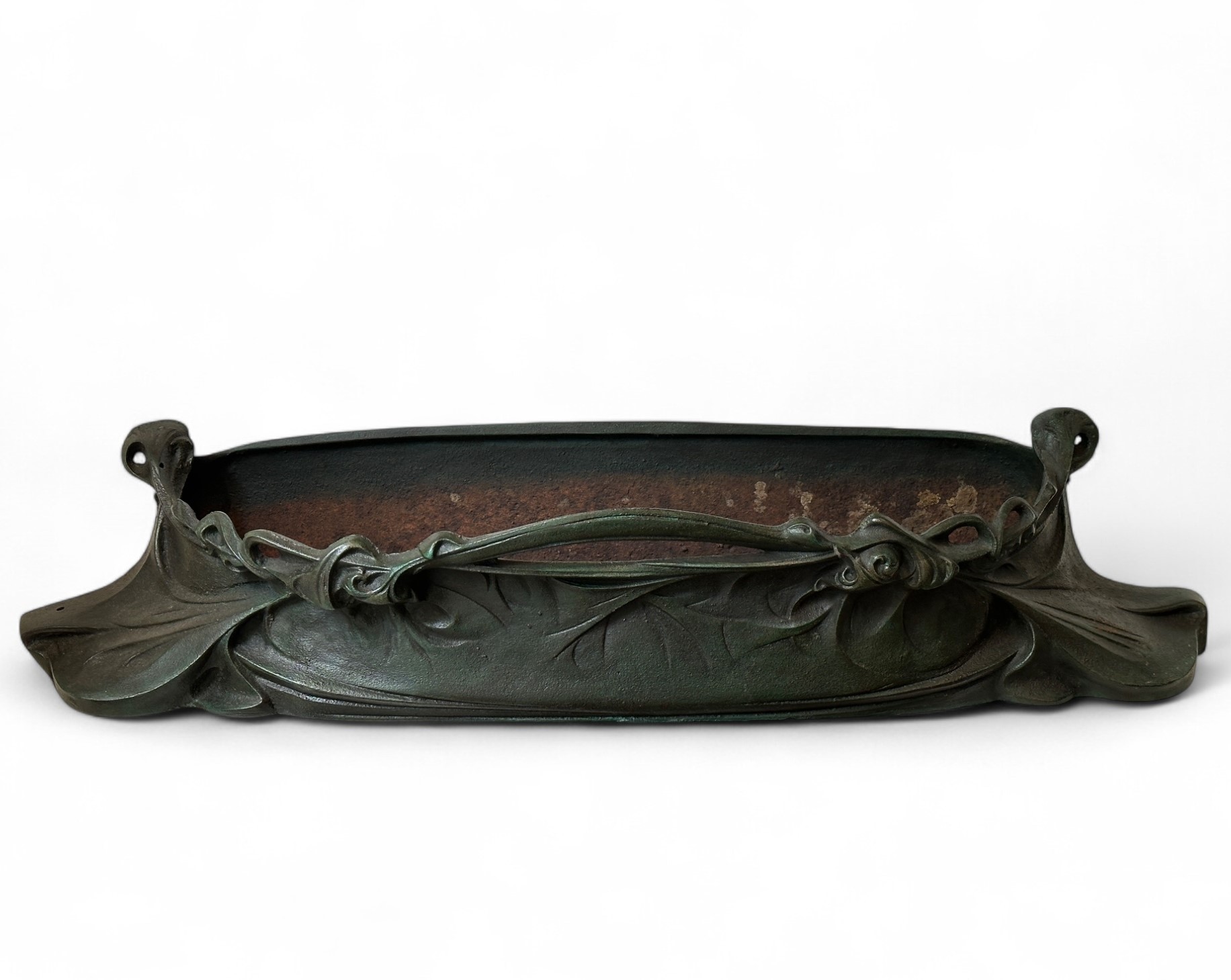 GF" planter in cast iron with antique green and shaded brown patina, slightly oxidized and repatinated, with scalloped body (oxidation and rust).