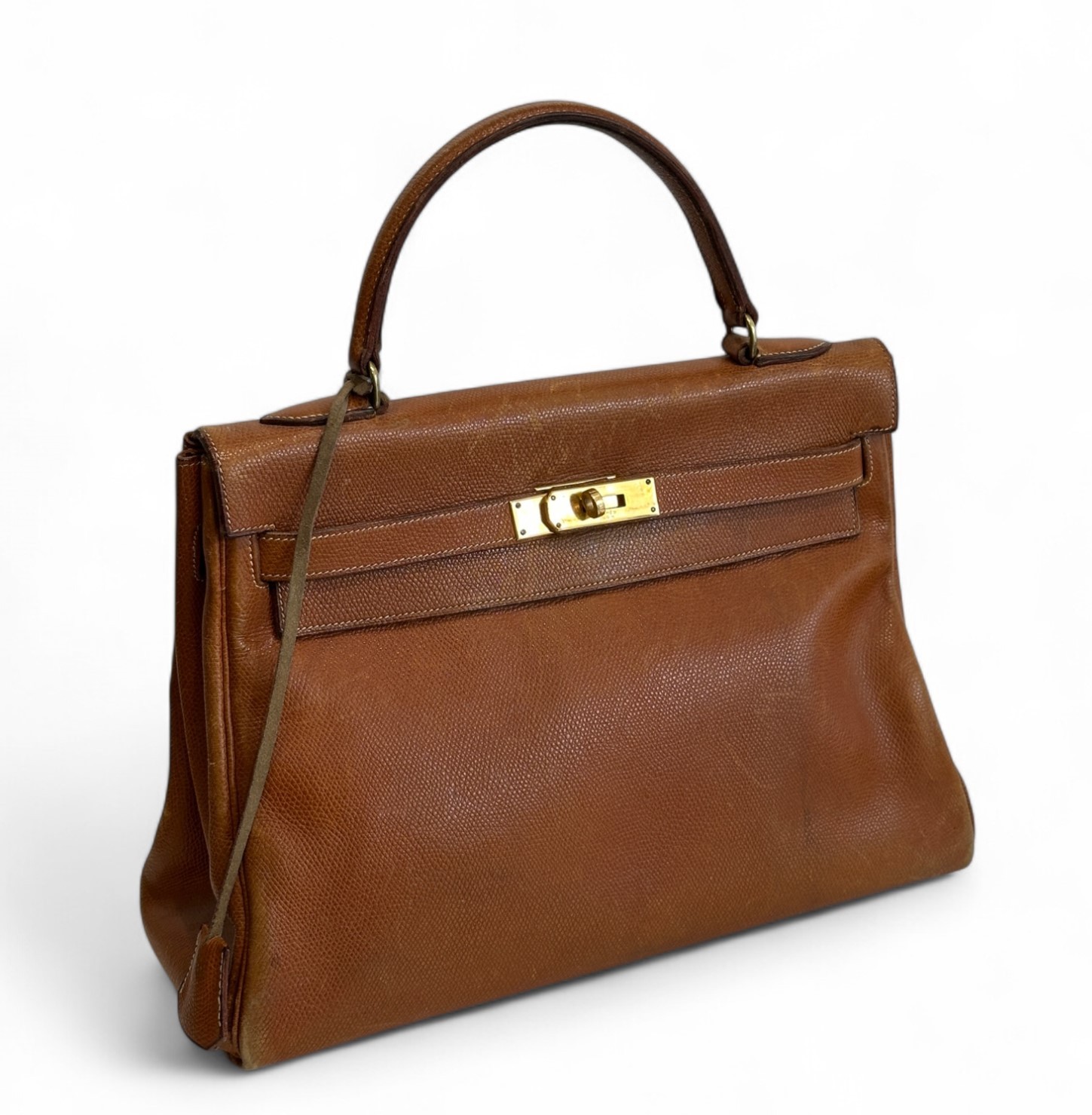HERMÈS 32cm reversed Kelly bag, in gold grained calfskin, gold goatskin lining, gold-plated metal jewelry, pull-tab and small bell Circa 1965 Used condition, wear and scratches Expert : Jérôme Lalande