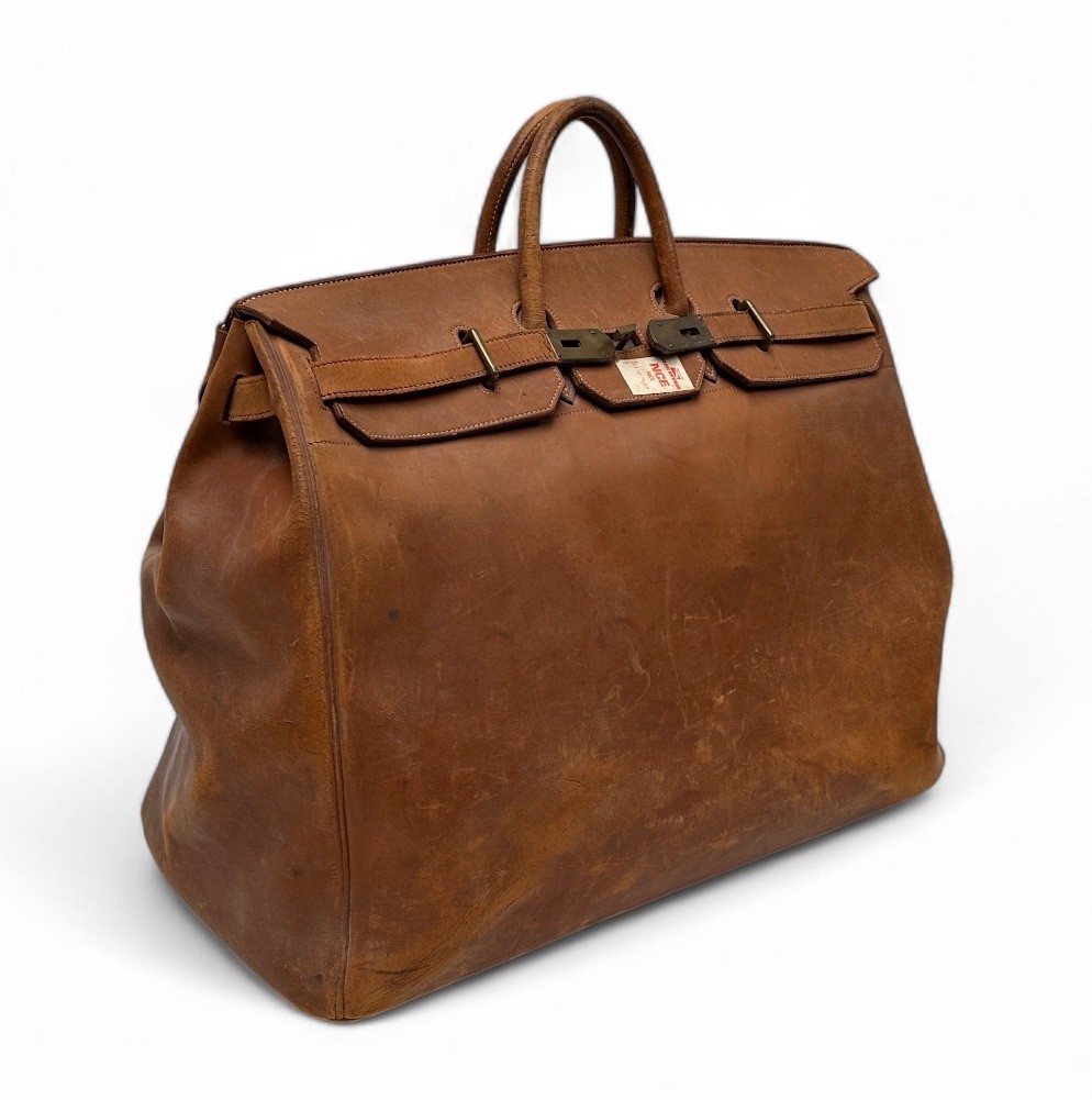 HERMÈS High bag with straps in natural cowhide 55 cm, unlined interior, polished brass jewelry Circa 1960 Used condition, wear Expert : Jérôme Lalande