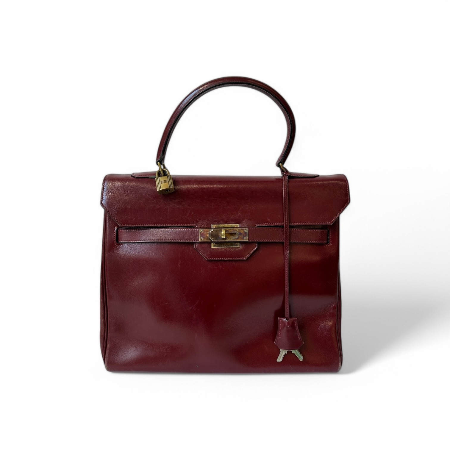 HERMÈS Monaco bag in red box calfskin, lining in red goatskin, gold-plated metal jewelry, pull-tab, bell, padlock and key Circa 1970 Good condition, patina and wear from use 29 cm Expert : Jérôme Lalande