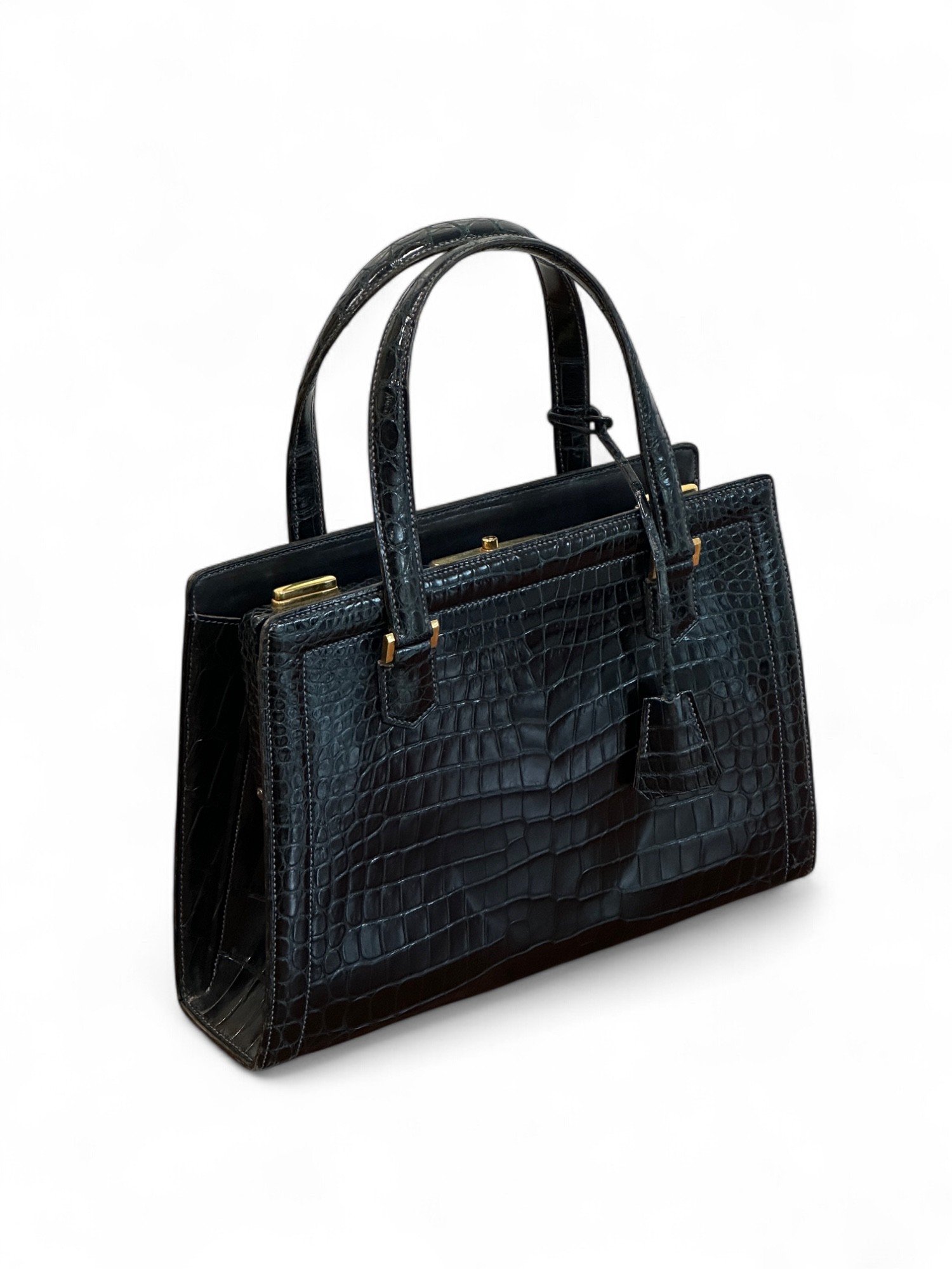 HERMÈS Pullman bag in black porosus crocodile, black lambskin lining, gold-plated metal jewelry, sold with its original key. Used condition Circa 1960 33 x 30 x 10 cm. Approx.