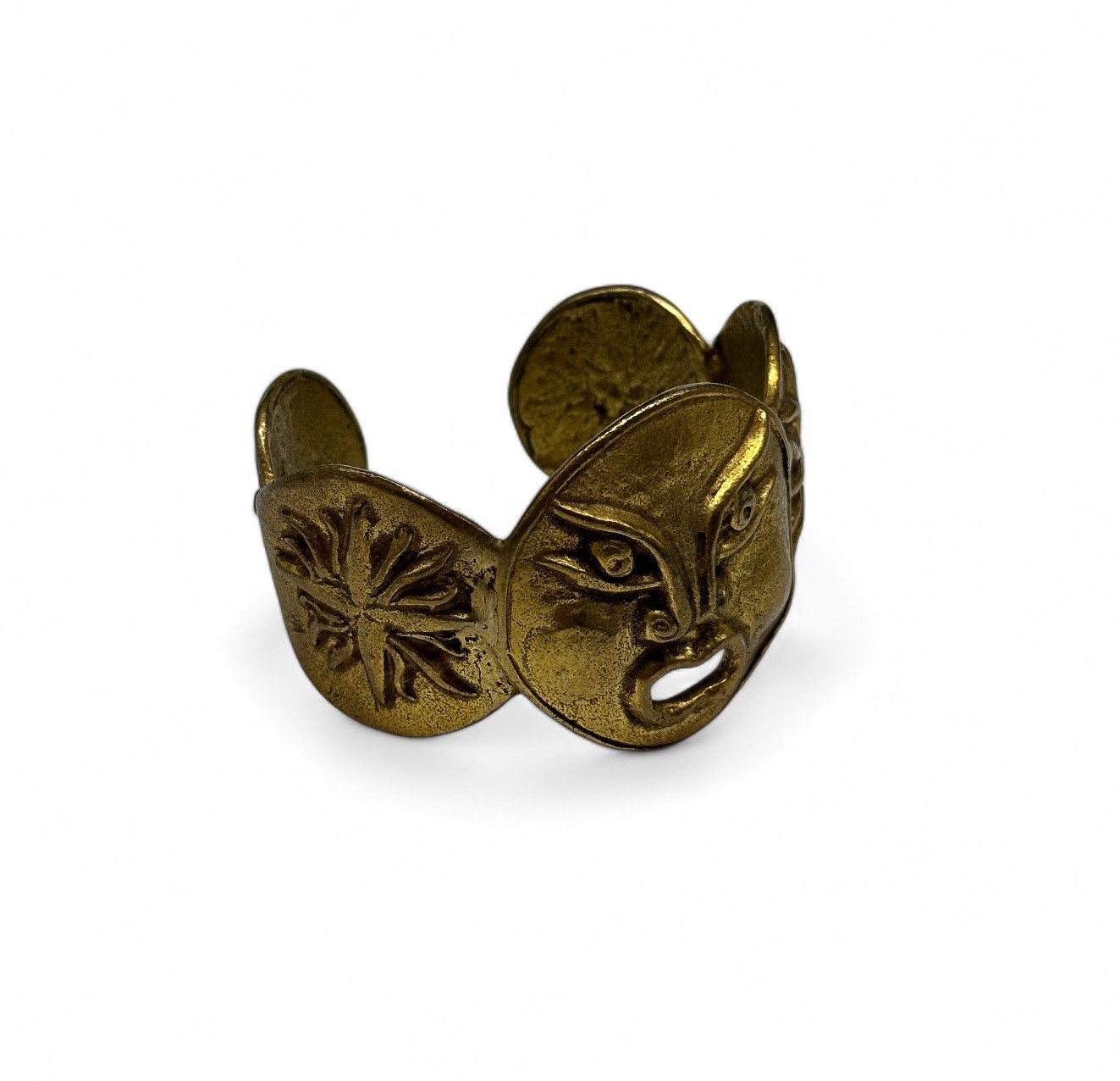 Hervé VAN DER STRAETEN Gilded brass bracelet decorated with an open-mouthed mask in a medallion flanked by flaming cruciform motifs. Stamped Van der Straeten on reverse 4.5 x 5.5 x 6.5 cm