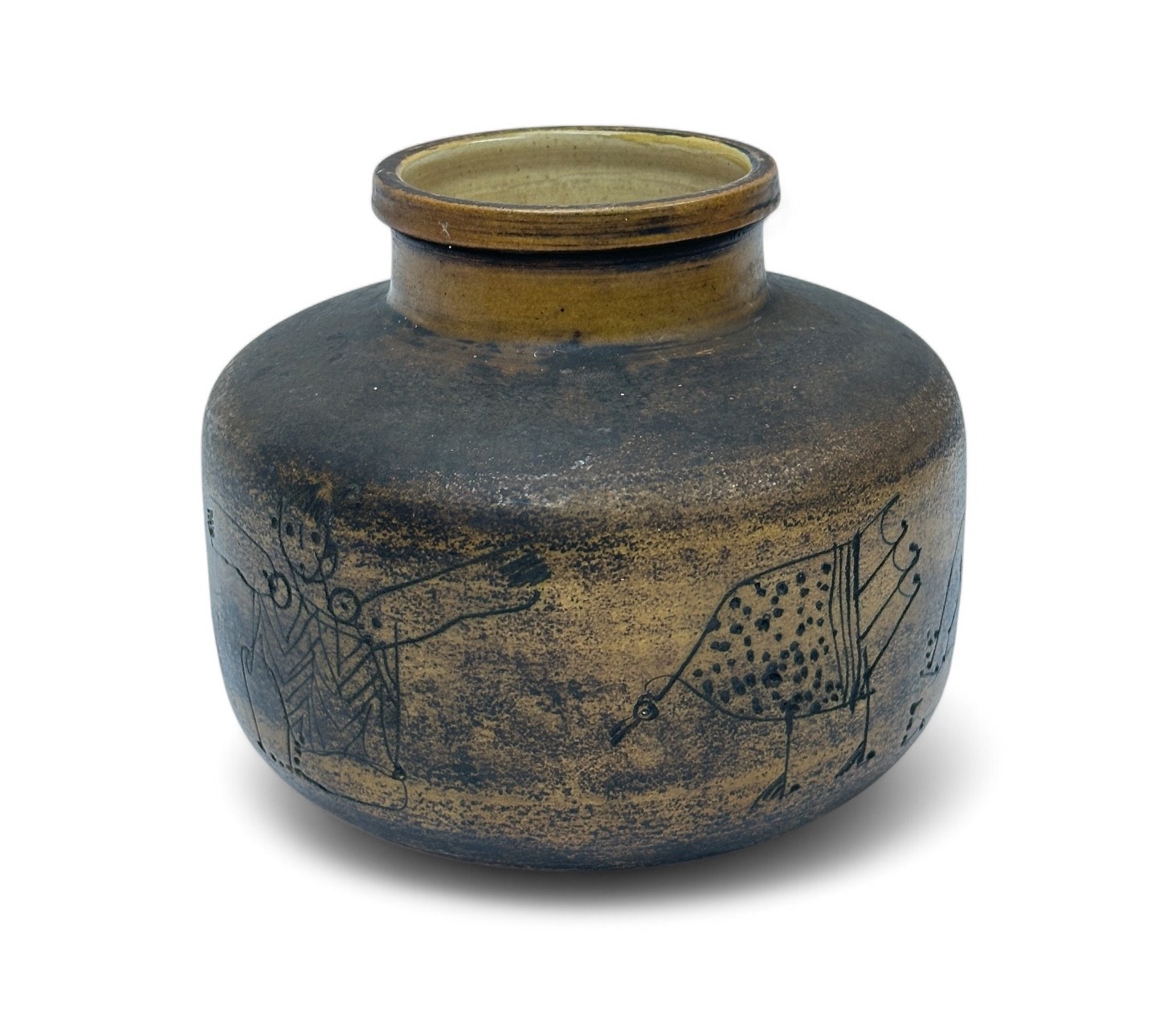 Jacques BLIN (1920-1995) Ball vase, circa 1955, with two handles. Yellow and black glazed ceramic proof with rotating stylized animal decoration. Signed J.Blin on reverse. H. 15.5 cm; Diam. 20 cm Expert : Romain Coulet